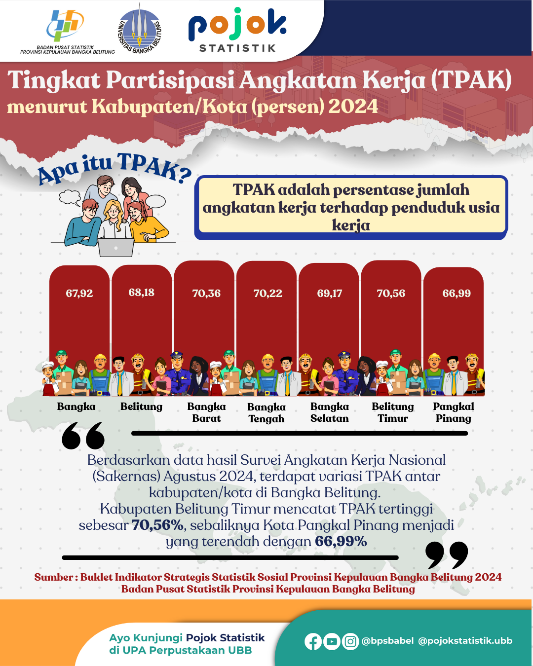 Berdasarkan data hasil Survei Angkatan Kerja Nasional (Sakernas) agustus 2024, terdapat variasi TPAK antar kabupaten/kota di Bangka Belitung. Kabupaten Belitung Timur mencatat TPAK tertinggi sebesar...