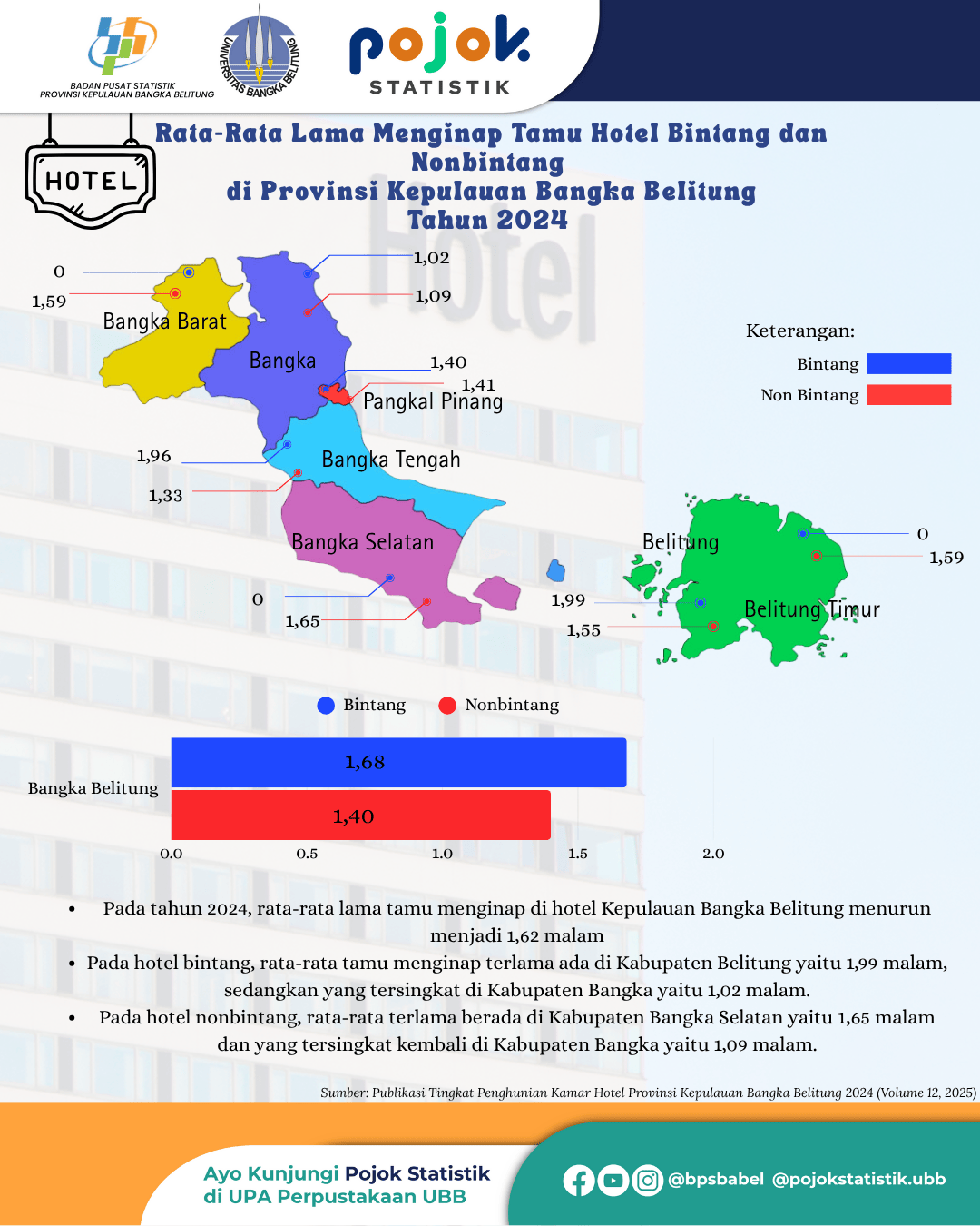 Pada tahun 2024, rata-rata lama menginap tamu hotel di Provinsi Kepulauan Bangka Belitung tercatat sebesar 1,62 malam, dengan hotel bintang rata-rata 1,68 malam dan nonbintang...