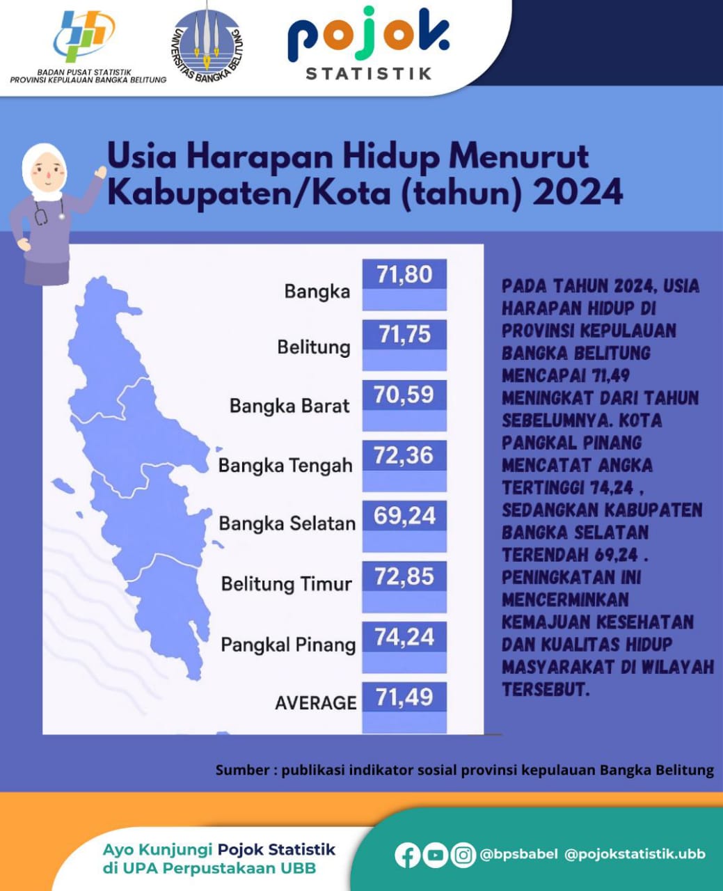 Pada Tahun 2024, usia harapan hidup di Provinsi Kepulauan Bangka Belitung mencapai 71,49 yang mana mengalami peningkatan dari tahun sebelumnya, yang mana peningkatan ini mencerminkan...