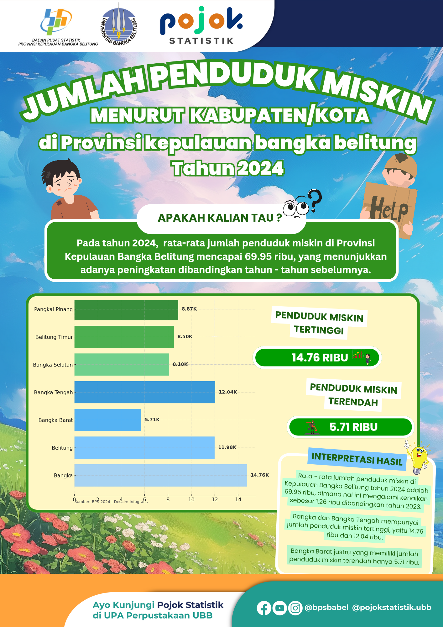 Infografis ini menampilkan jumlah penduduk miskin menurut Kabupaten/Kota di Provinsi Kepulauan Bangka Belitung tahun 2024. Rata- rata jumlah penduduk miskin di provinsi Kepulauan Bangka Belitung...