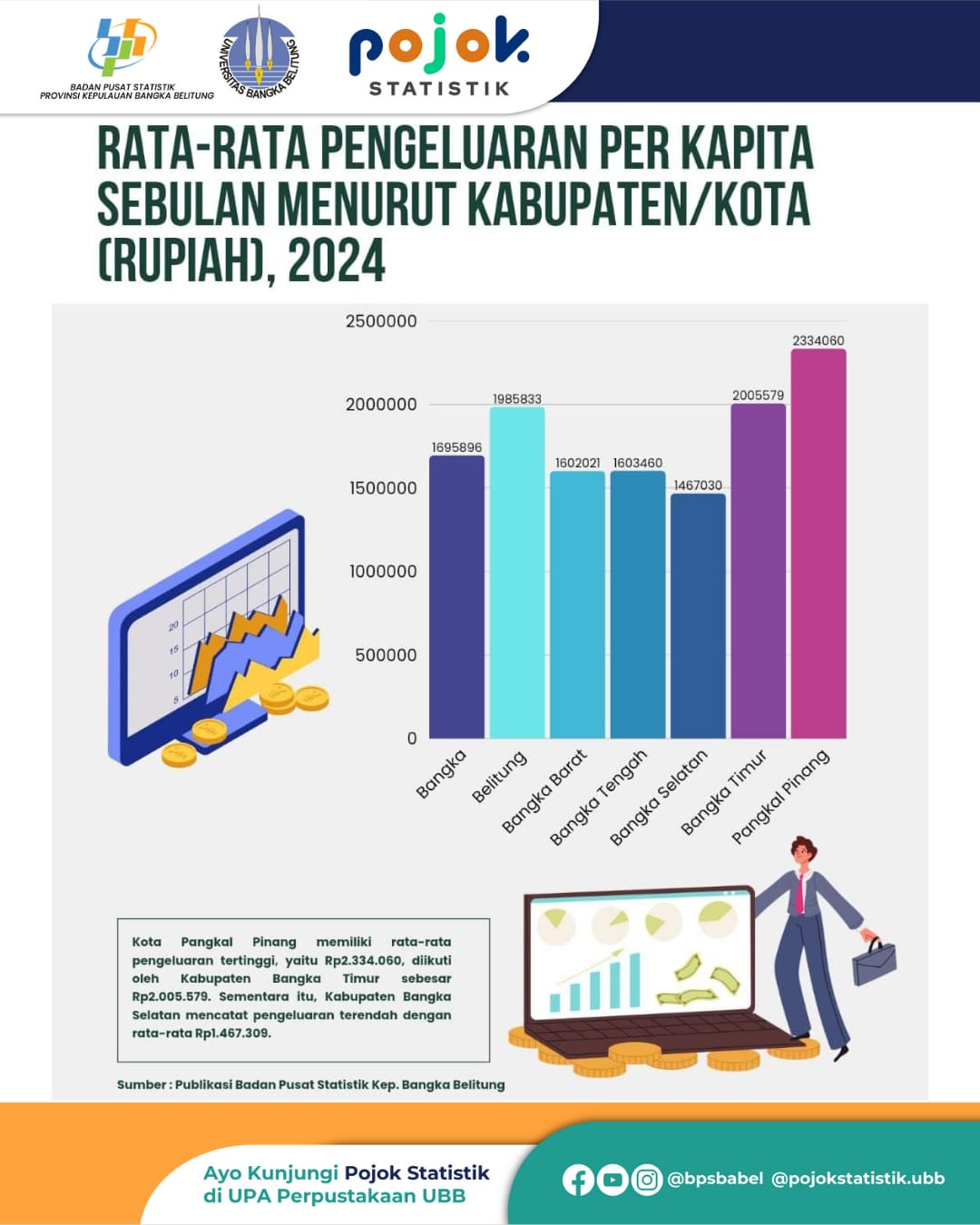Kota Pangkal Pinang memiliki rata-rata pengeluaran tertinggi, yaitu Rp2.334.060, diikuti oleh Kabupaten Bangka Timur sebesar Rp2.005.579. Sementara itu, Kabupaten Bangka Selatan mencatat pengeluaran terendah dengan...