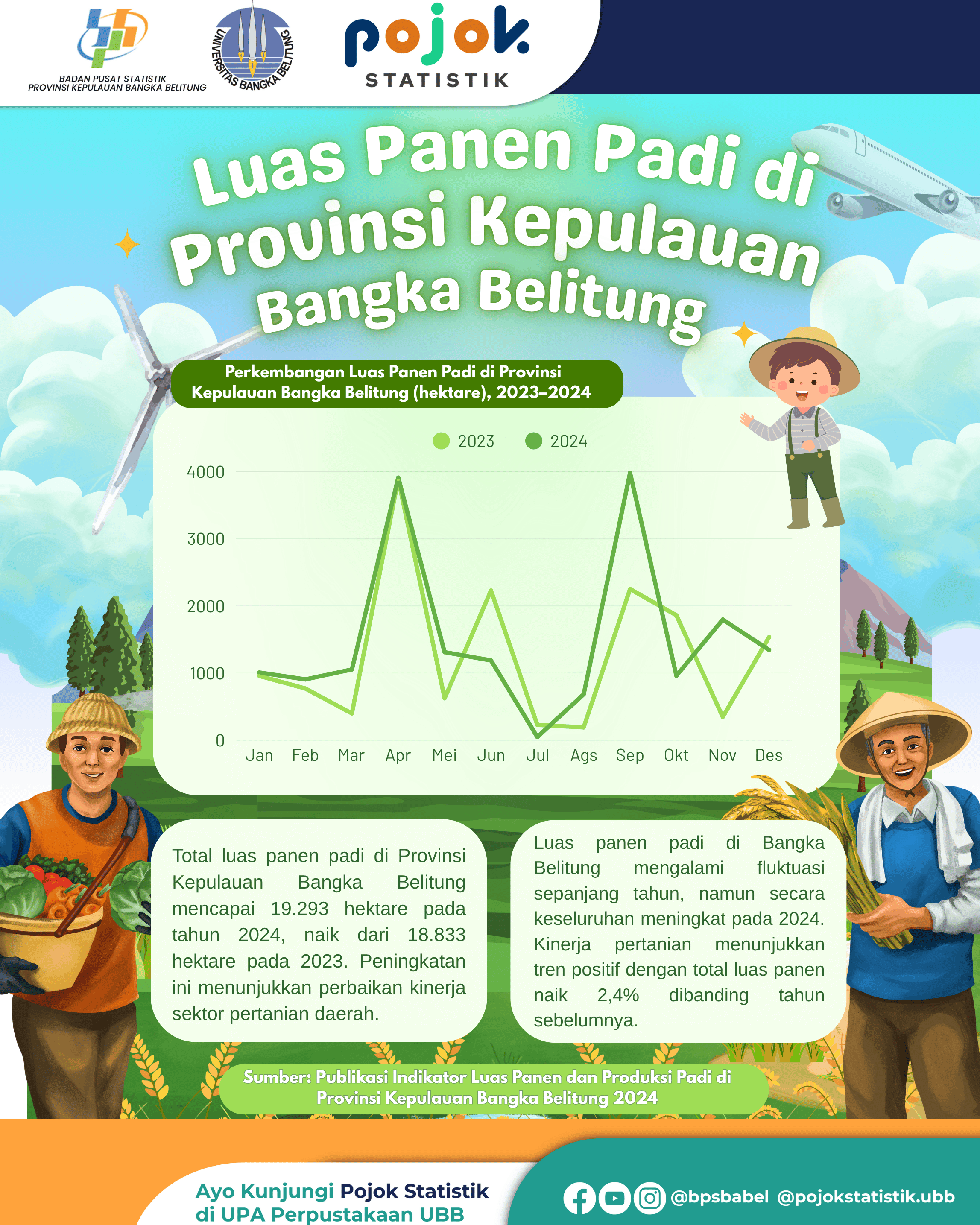 Infografis ini menampilkan perkembangan luas panen padi di Provinsi Kepulauan Bangka Belitung selama periode 2023–2024. Melalui grafik garis, terlihat bahwa luas panen mengalami fluktuasi tiap...
