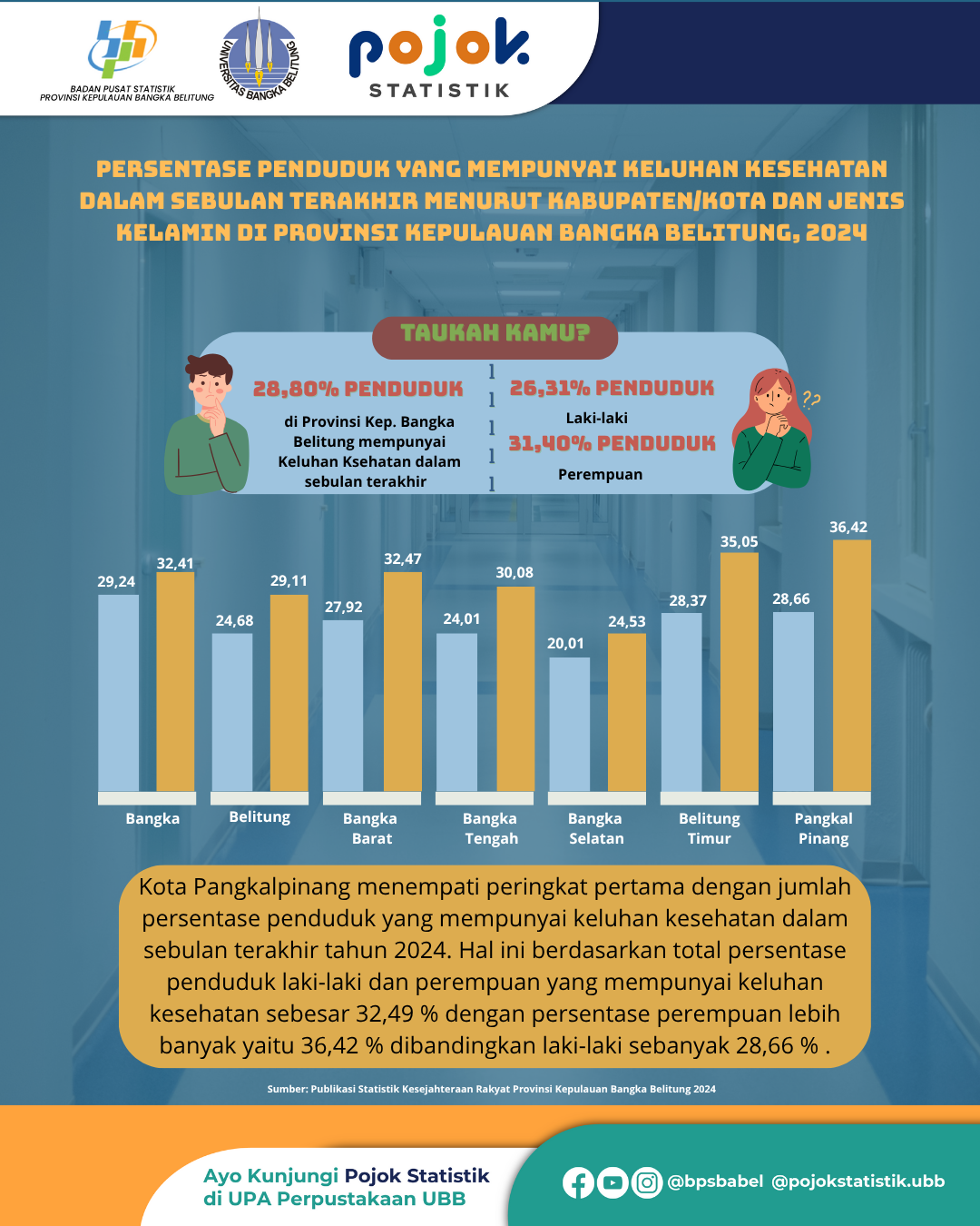 Kota Pangkalpinang menempati peringkat pertama dengan jumlah persentase penduduk yang mempunyai keluhan kesehatan dalam sebulan terakhir tahun 2024. Hal ini berdasarkan total persentase penduduk laki-laki...