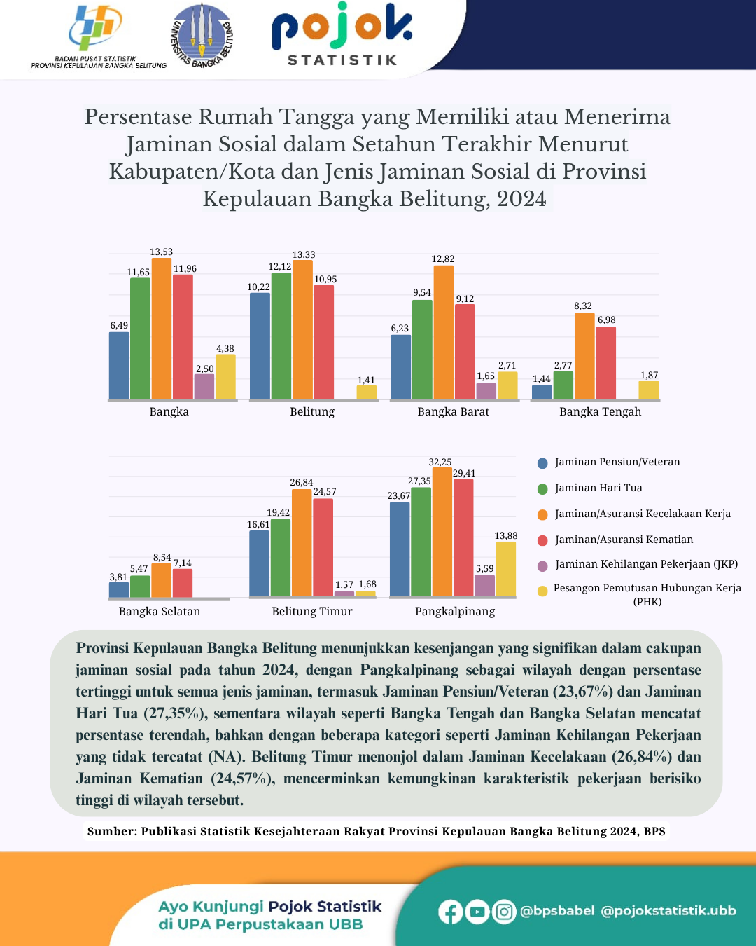 Provinsi Kepulauan Bangka Belitung menunjukkan kesenjangan yang signifikan dalam cakupan jaminan sosial pada tahun 2024, dengan Pangkalpinang sebagai wilayah dengan persentase tertinggi untuk semua jenis...
