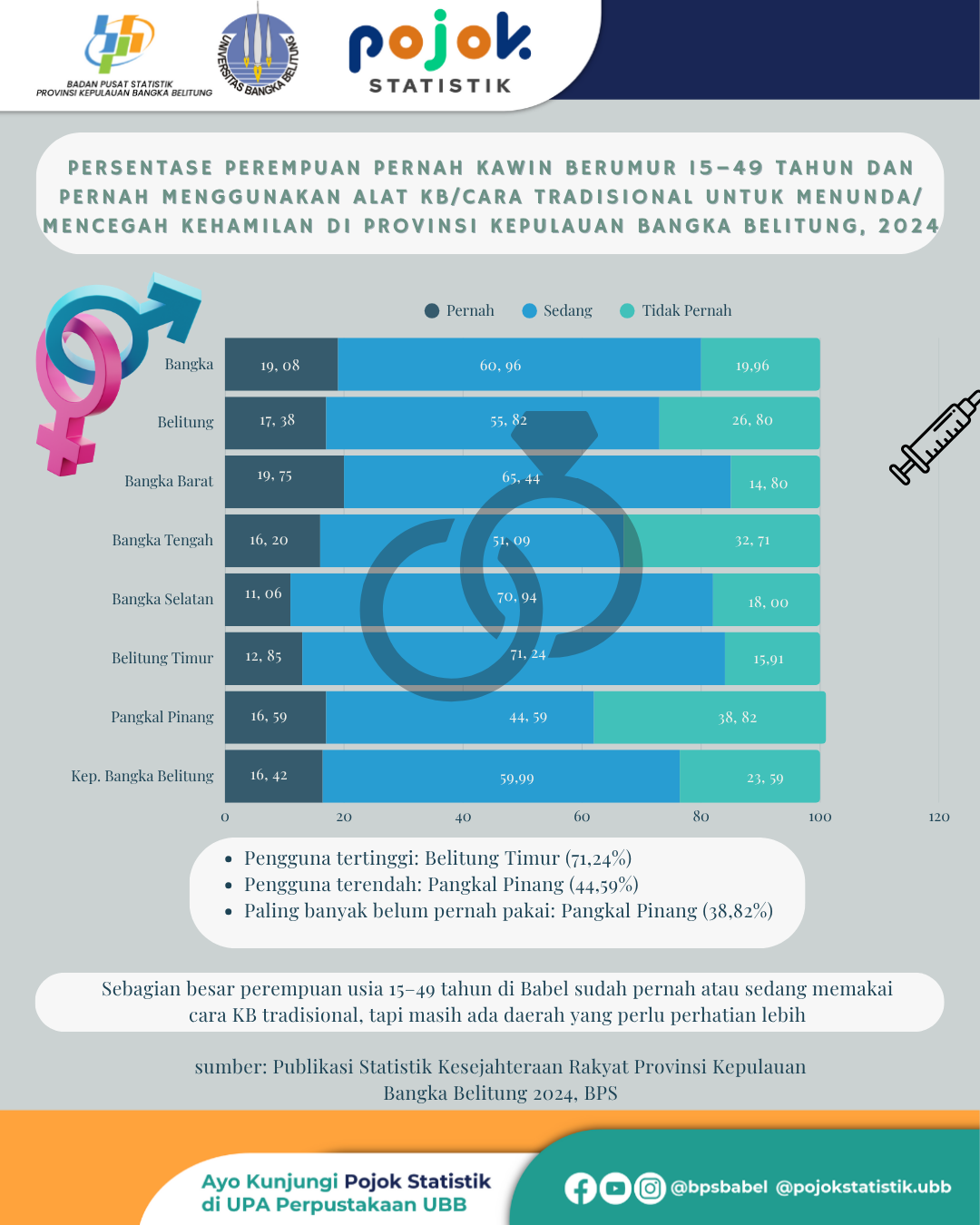 Sebagian besar perempuan usia 15–49 tahun di Babel sudah pernah atau sedang memakai cara KB tradisional, tapi masih ada daerah yang perlu perhatian lebih