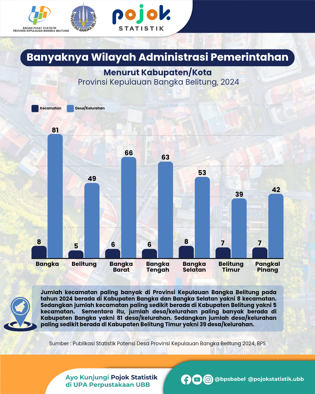 Jumlah kecamatan paling banyak di Provinsi Kepulauan Bangka Belitung pada tahun 2024 berada di Kabupaten Bangka dan Bangka Selatan yakni 8 kecamatan. Sedangkan jumlah kecamatan...