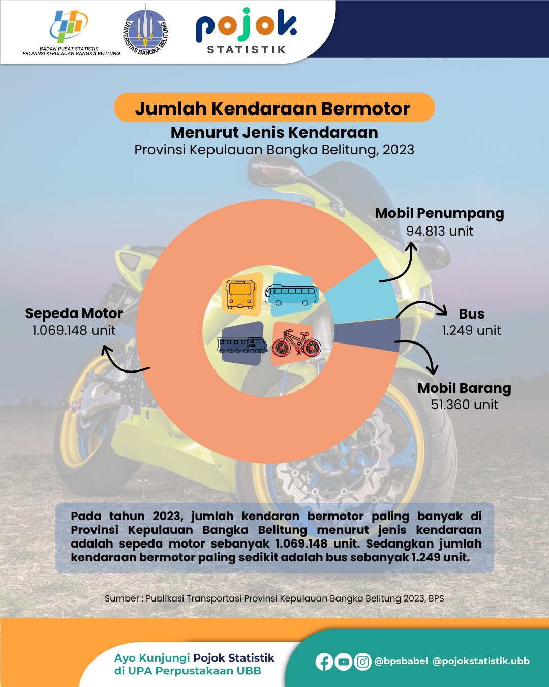 Pada tahun 2023, jumlah kendaran bermotor paling banyak di Provinsi Kepulauan Bangka Belitung menurut jenis kendaraan adalah sepeda motor sebanyak 1.069.148 unit. Sedangkan jumlah kendaraan...