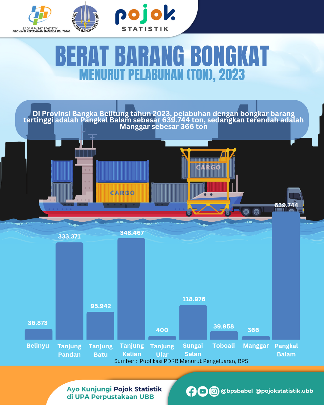 Di Provinsi Bangka Belitung tahun 2023, pelabuhan dengan bongkar barang tertinggi adalah Pangkal Balam sebesar 639.744 ton, sedangkan terendah adalah Manggar sebesar 366 ton.