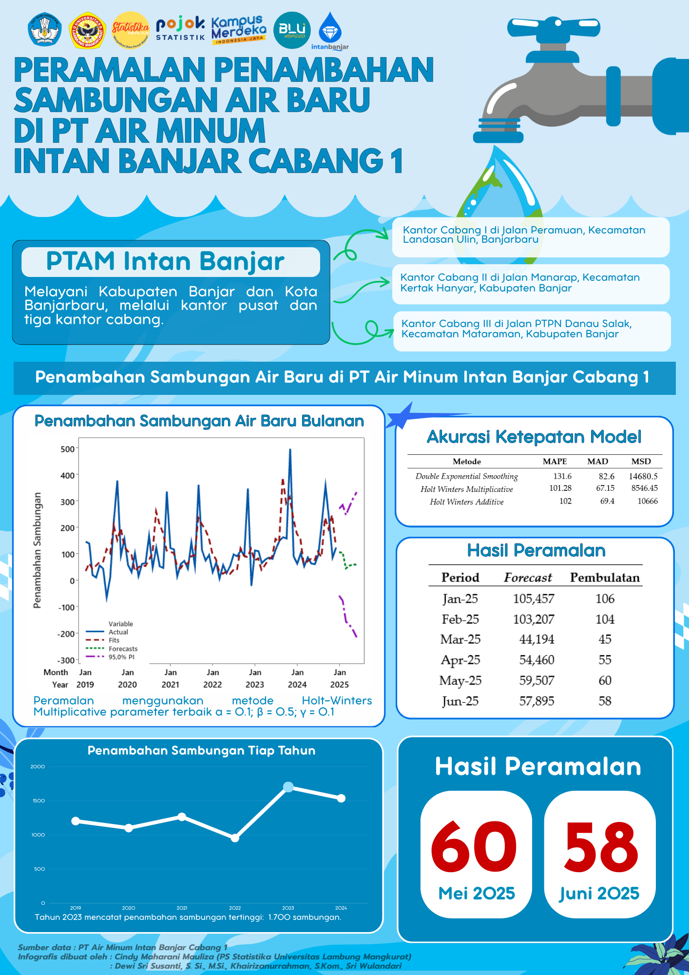 Infografis ini menyajikan informasi mengenai hasil peramalan penambahan sambungan air baru di PT Air Minum Intan Banjar Cabang 1. Dengan menggunakan metode Holt-Winters Multiplicative, peramalan...