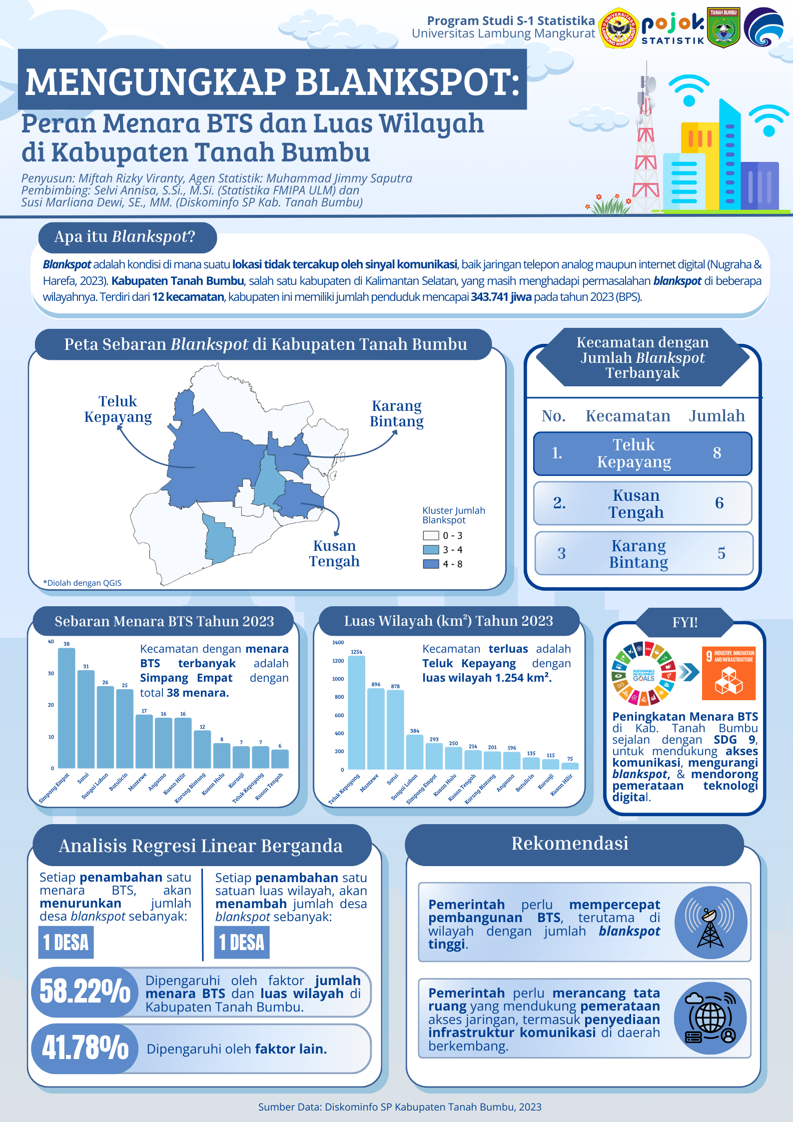 Di Kabupaten Tanah Bumbu, Kalimantan Selatan, masih terdapat wilayah blankspot atau belum terjangkau sinyal komunikasi. Melalui analisis regresi berganda yang disajikan dalam infografis ini, diperoleh...
