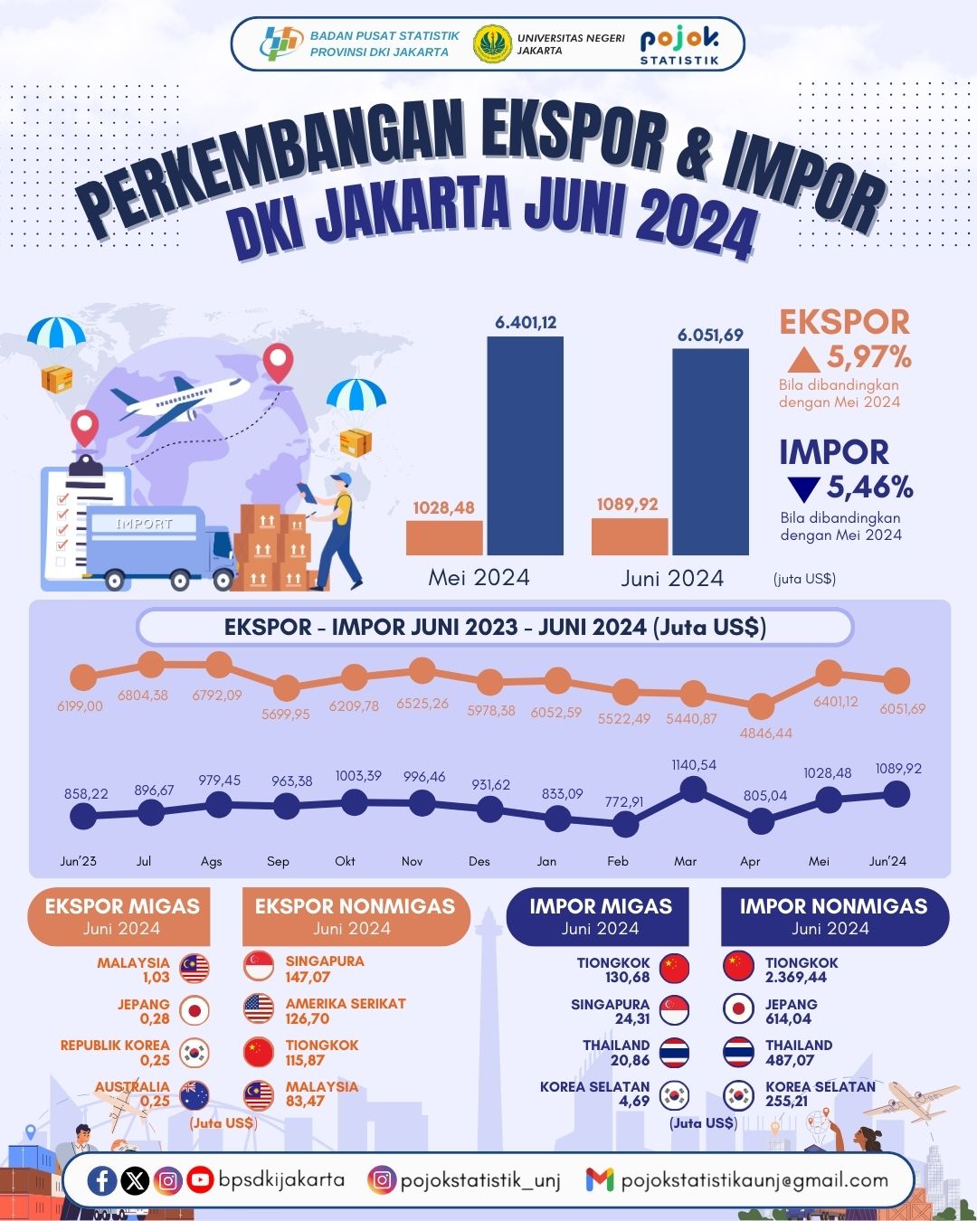 🌍📦 Ekspor DKI Jakarta Turun, Impor Naik di Juni 2024! Perdagangan luar negeri Jakarta masih dinamis! Yuk intip datanya: 📉 Ekspor Juni 2024: 🟦 USD...