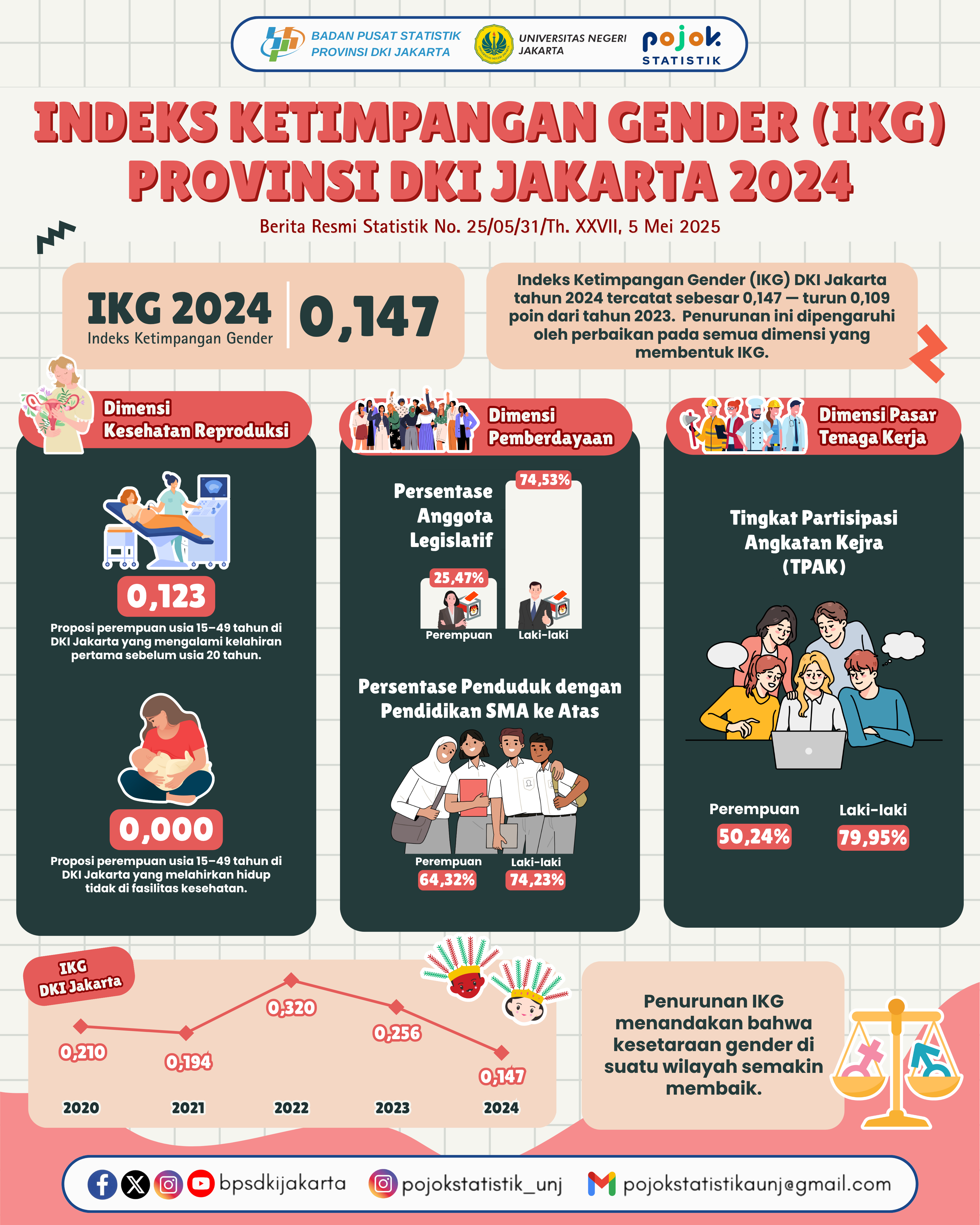 Kabar baik dari Jakarta! π Indeks Ketimpangan Gender (IKG) 2024 turun jadi 0,147, terendah dalam 5 tahun terakhir. Penurunan ini mencerminkan makin membaiknya kesetaraan gender...