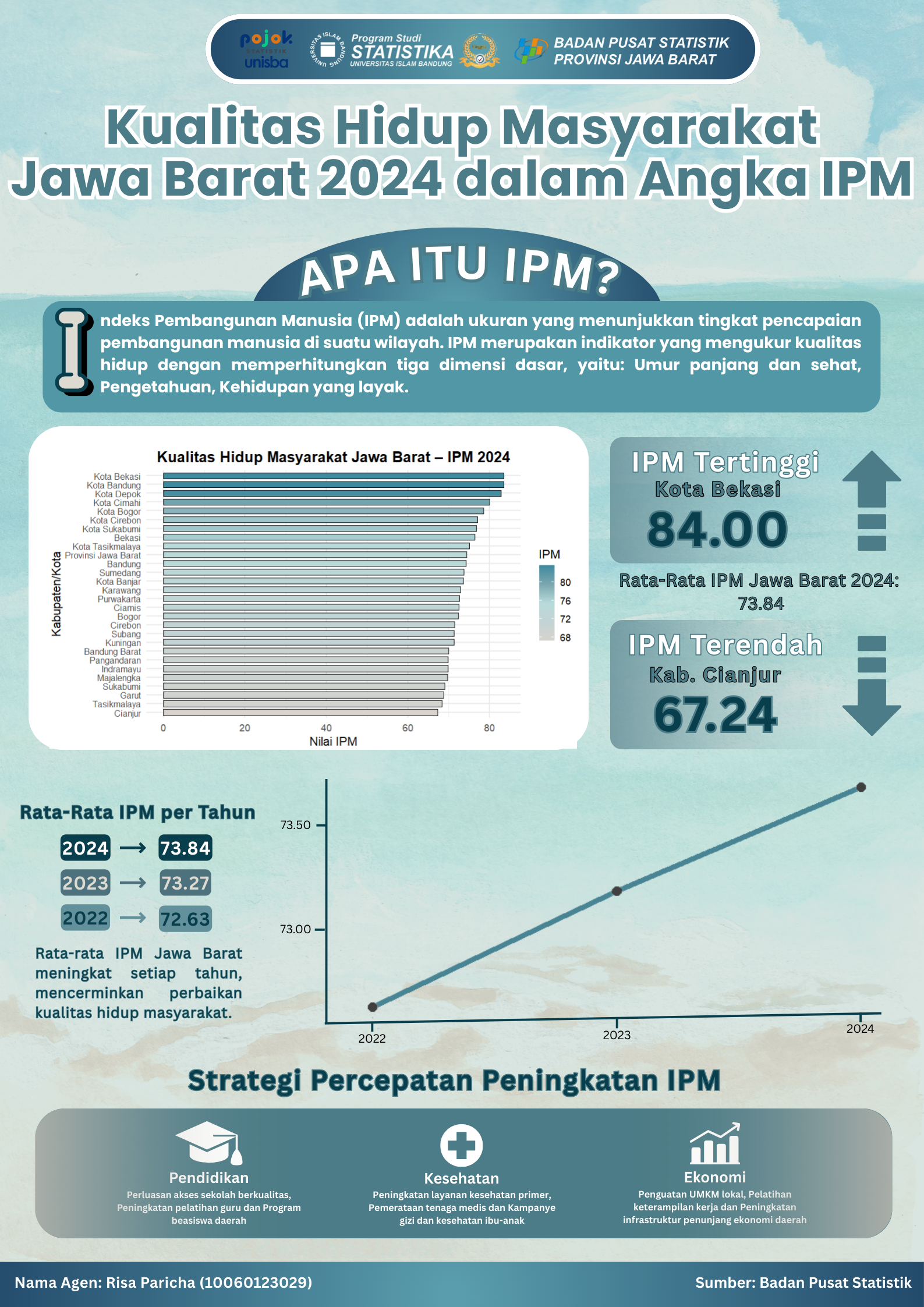 Infografis ini menampilkan IPM Jawa Barat 2024 sebesar 73,84, naik dari tahun sebelumnya. Kota Bekasi tertinggi (84,00) dan Kabupaten Cianjur terendah (67,24), dengan strategi peningkatan...