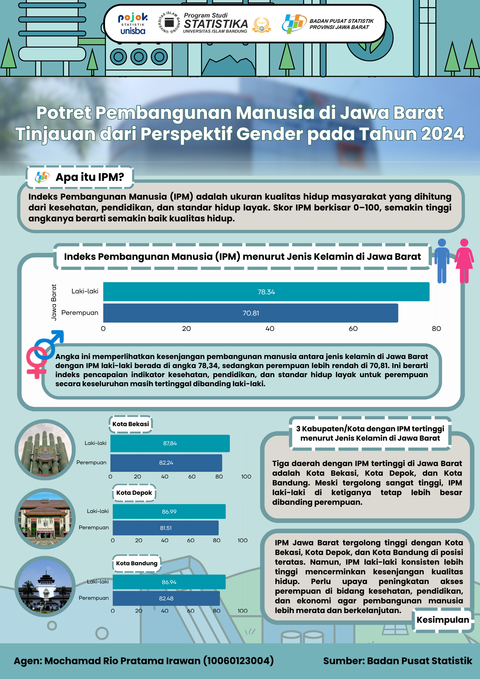 Infografis ini menunjukkan IPM Jawa Barat 2024 menurut gender, di mana laki-laki mencapai 78,34 dan perempuan 70,81, masih terdapat kesenjangan. Tiga daerah dengan IPM tertinggi...