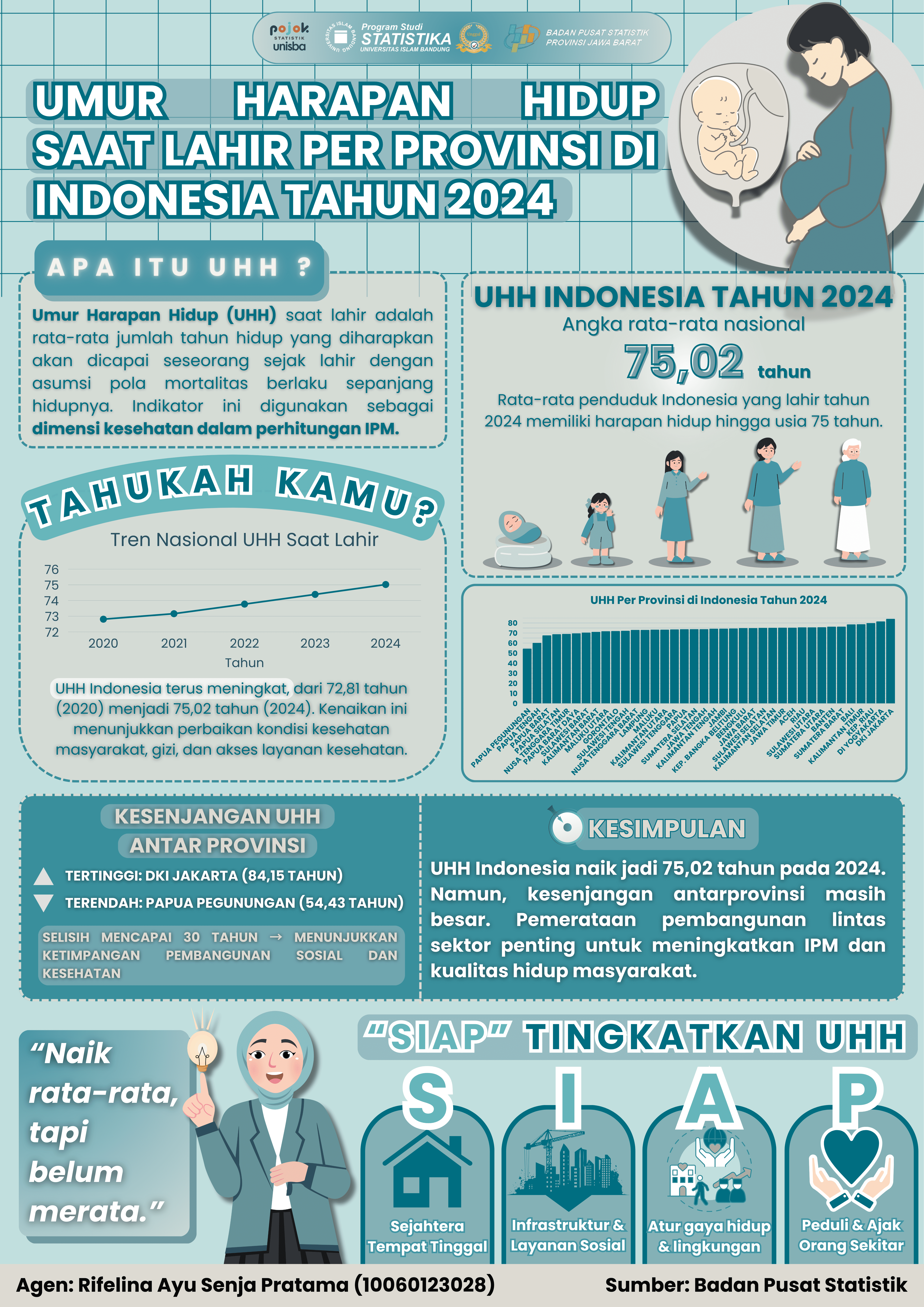 Infografis ini menyajikan gambaran Umur Harapan Hidup (UHH) Saat Lahir di Indonesia tahun 2024. UHH merupakan salah satu indikator penting dalam dimensi kesehatan Indeks Pembangunan...