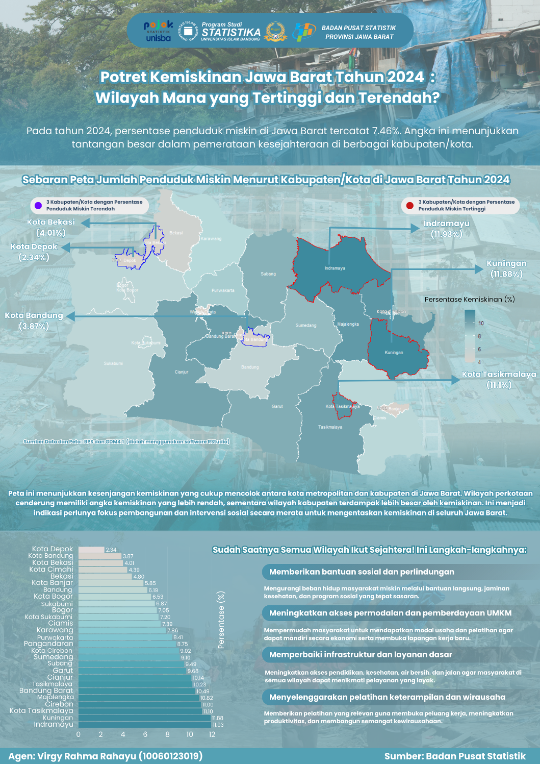 Infografis ini menggambarkan kemiskinan di Jawa Barat tahun 2024 (7,46%). Kota Depok terendah (2,34%) dan Indramayu tertinggi (11,93%). Terlihat kesenjangan antara kota metropolitan dan kabupaten,...