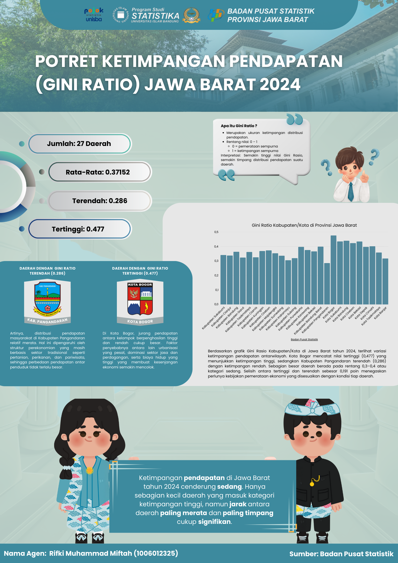Infografis ini menunjukkan ketimpangan pendapatan di Jawa Barat 2024 berdasarkan Gini Rasio. Kabupaten Pangandaran memiliki ketimpangan terendah (0,286), sedangkan Kota Bogor tertinggi (0,477). Sebagian besar...