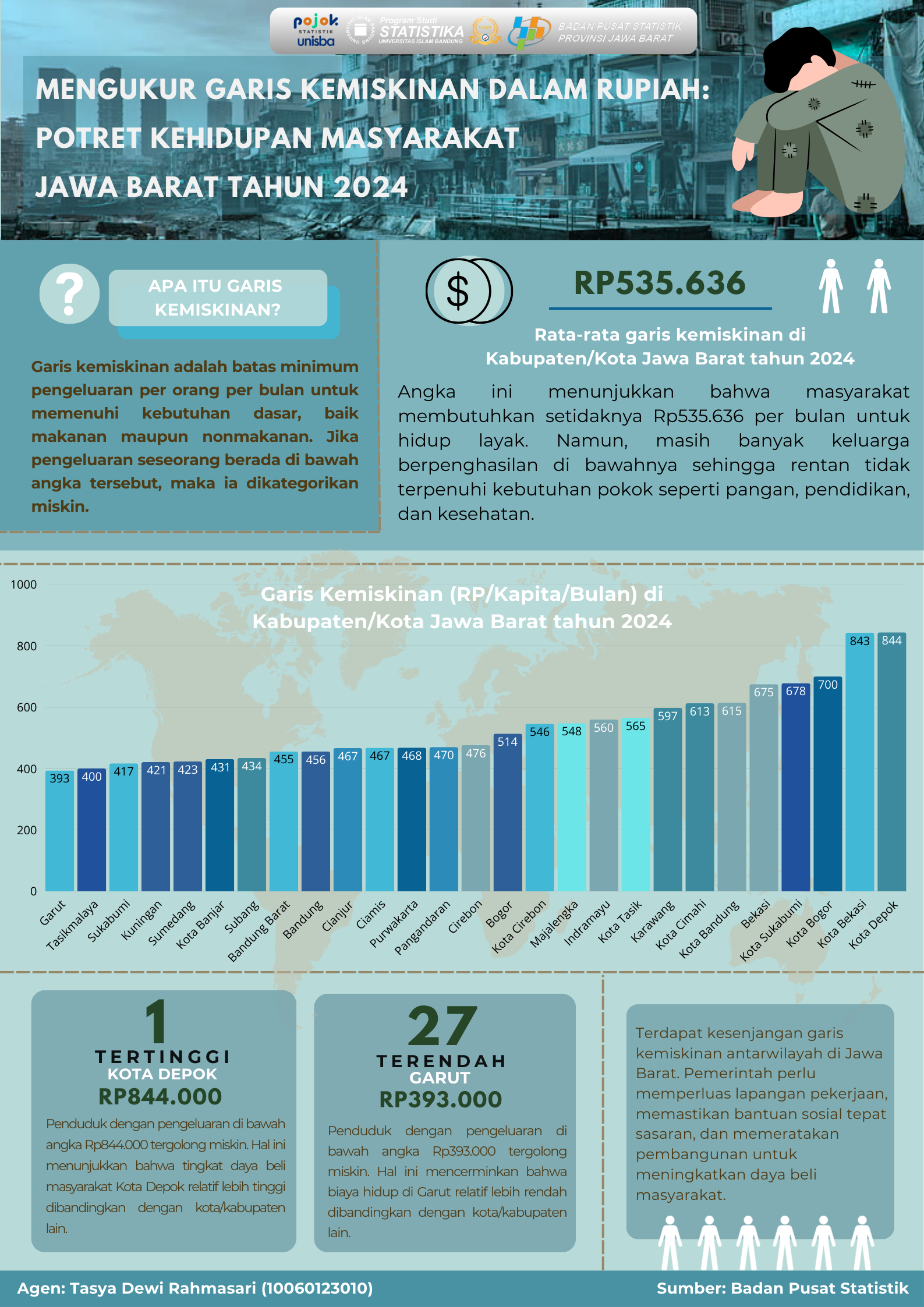 Infografis ini menggambarkan garis kemiskinan Jawa Barat 2024 dengan rata-rata Rp535.636 per kapita per bulan, tertinggi di Kota Depok (Rp844.000) dan terendah di Garut (Rp393.000),...