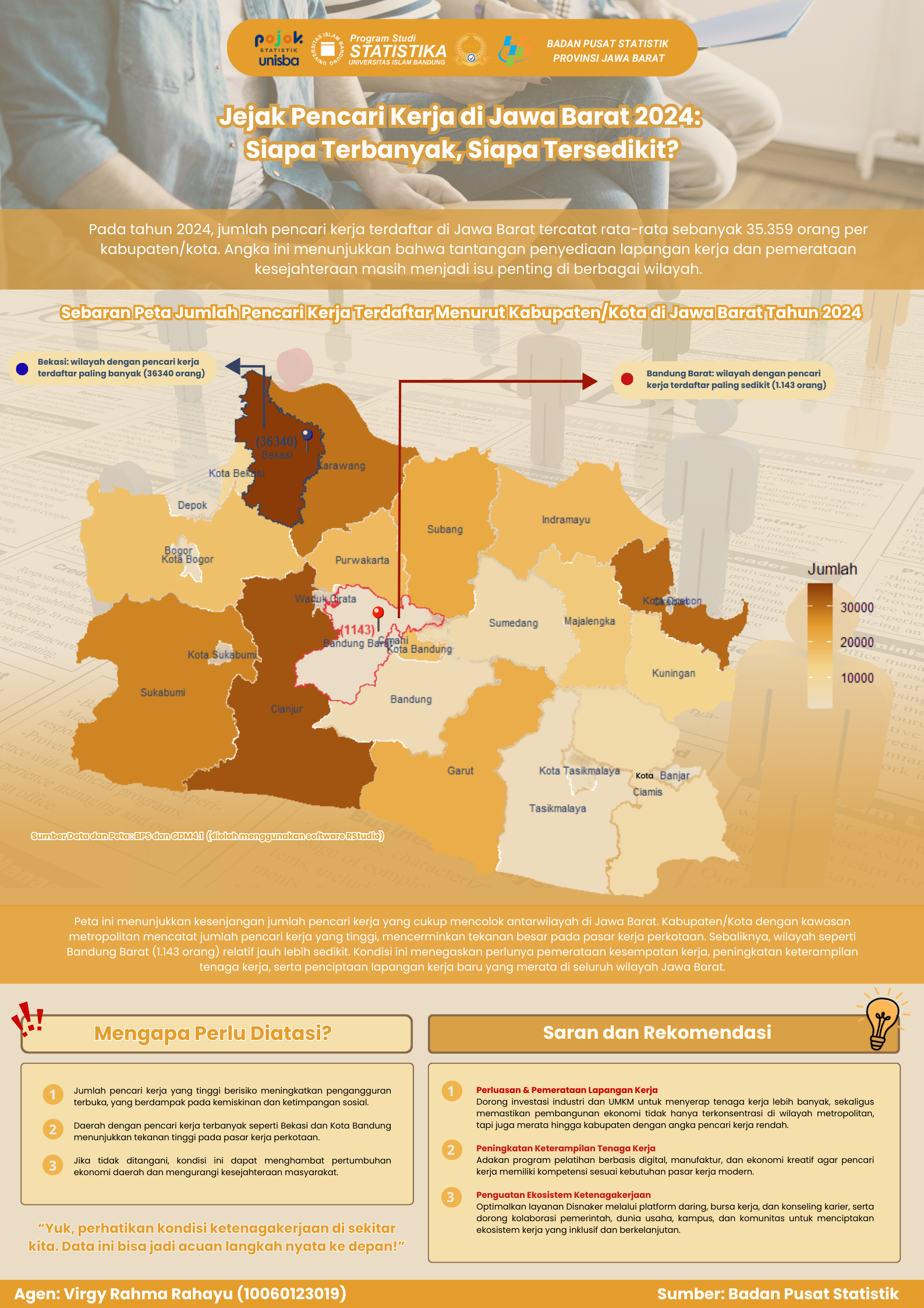 Infografis ini menampilkan jumlah pencari kerja terdaftar di Jawa Barat tahun 2024, dengan Bekasi sebagai wilayah terbanyak (36.340 orang) dan Bandung Barat paling sedikit (1.143...