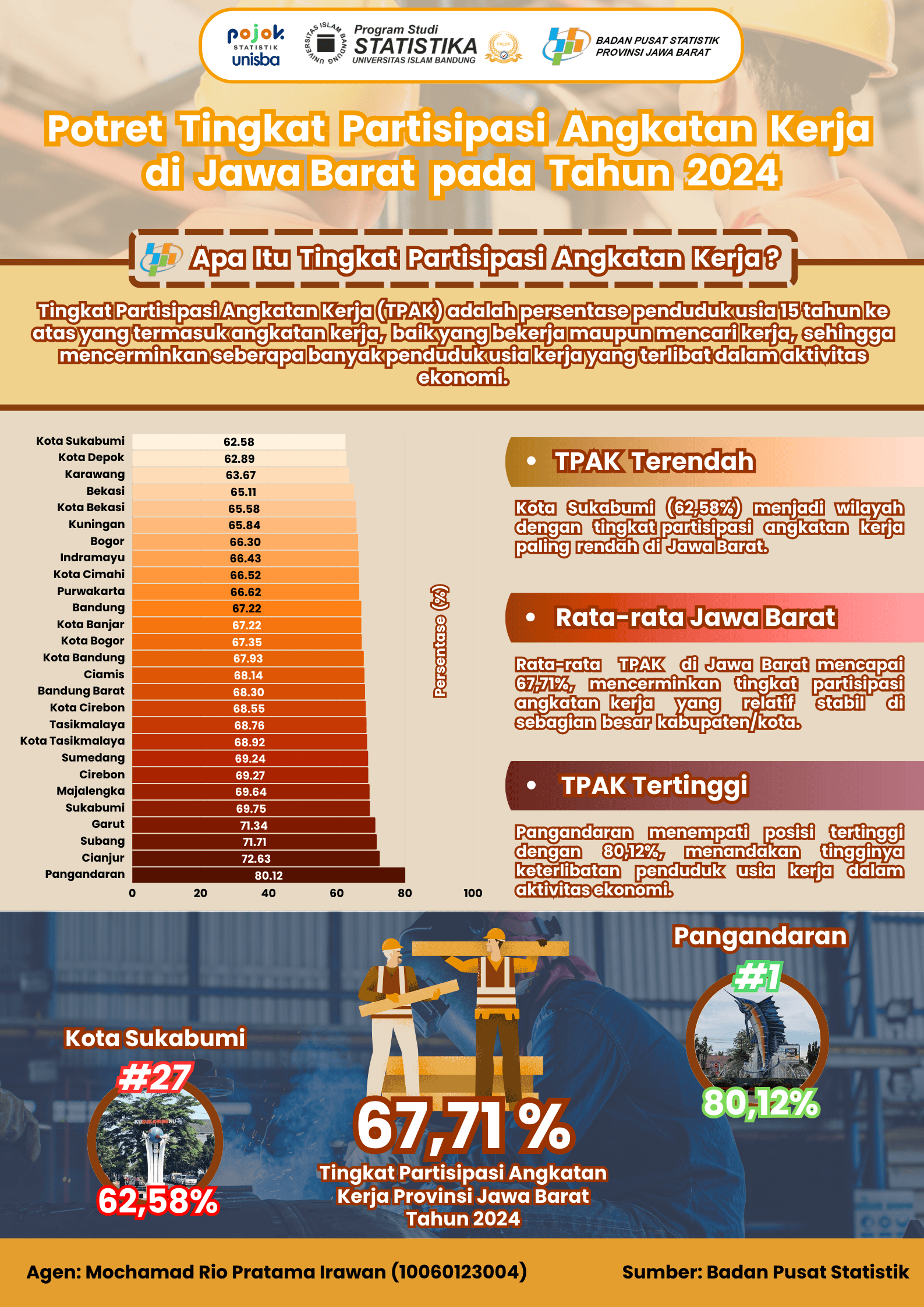 Infografis ini menampilkan Tingkat Partisipasi Angkatan Kerja (TPAK) di Jawa Barat tahun 2024. Rata-rata TPAK provinsi tercatat 67,71%, dengan Pangandaran tertinggi (80,12%) dan Kota Sukabumi...