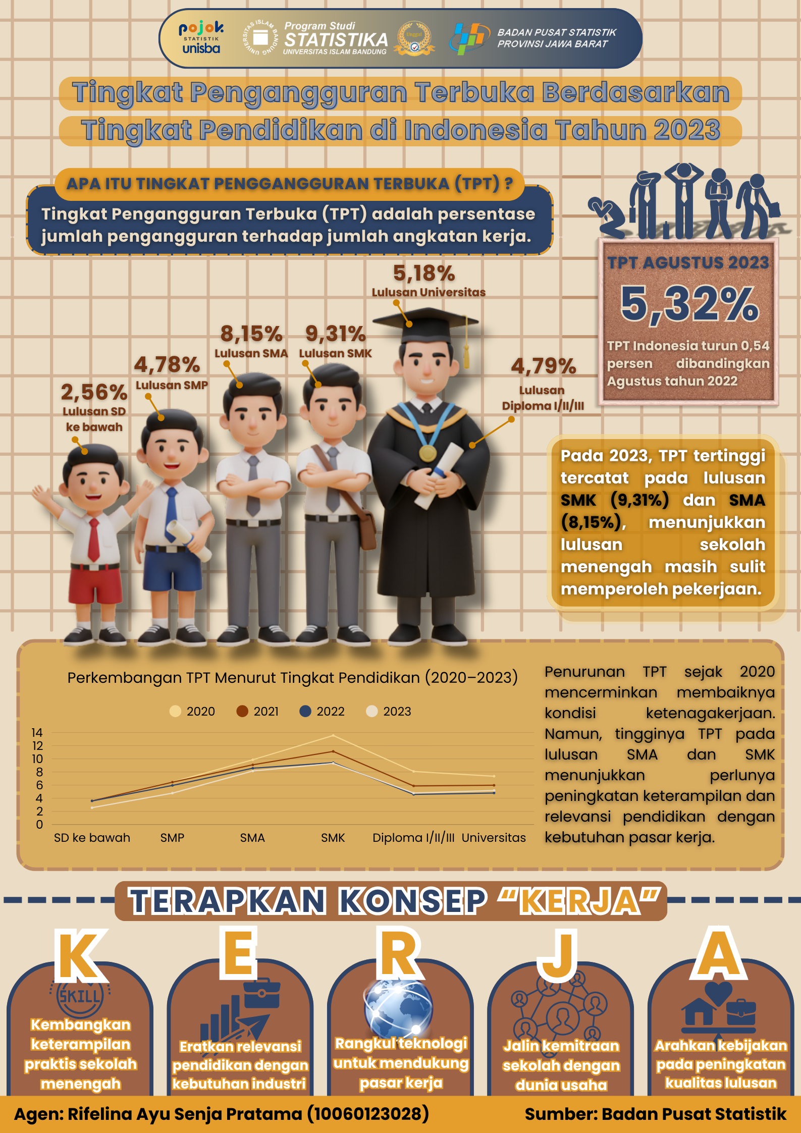 Infografis ini menampilkan Tingkat Pengangguran Terbuka (TPT) berdasarkan tingkat pendidikan di Indonesia tahun 2023. Rata-rata TPT tercatat 5,32%, turun 0,54 persen dari tahun sebelumnya. TPT...