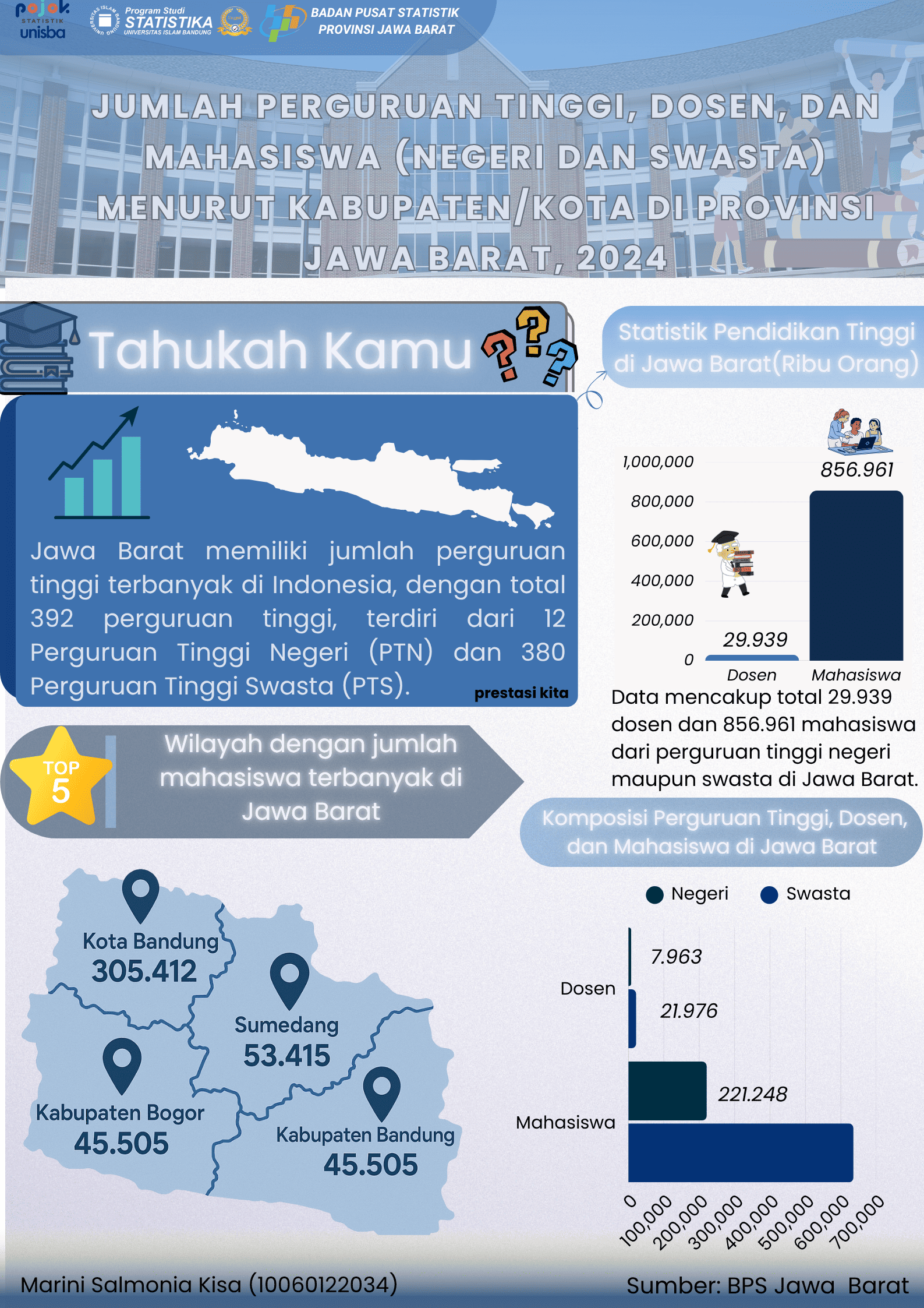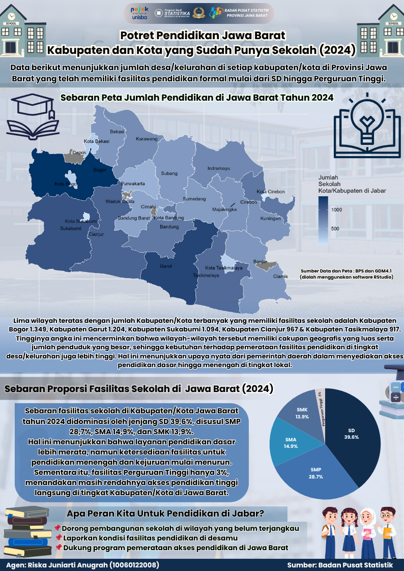 Infografis ini menampilkan potret kondisi pendidikan di Provinsi Jawa Barat tahun 2024. Disajikan dalam dua visual utama, yaitu peta sebaran jumlah fasilitas sekolah per kabupaten/kota...