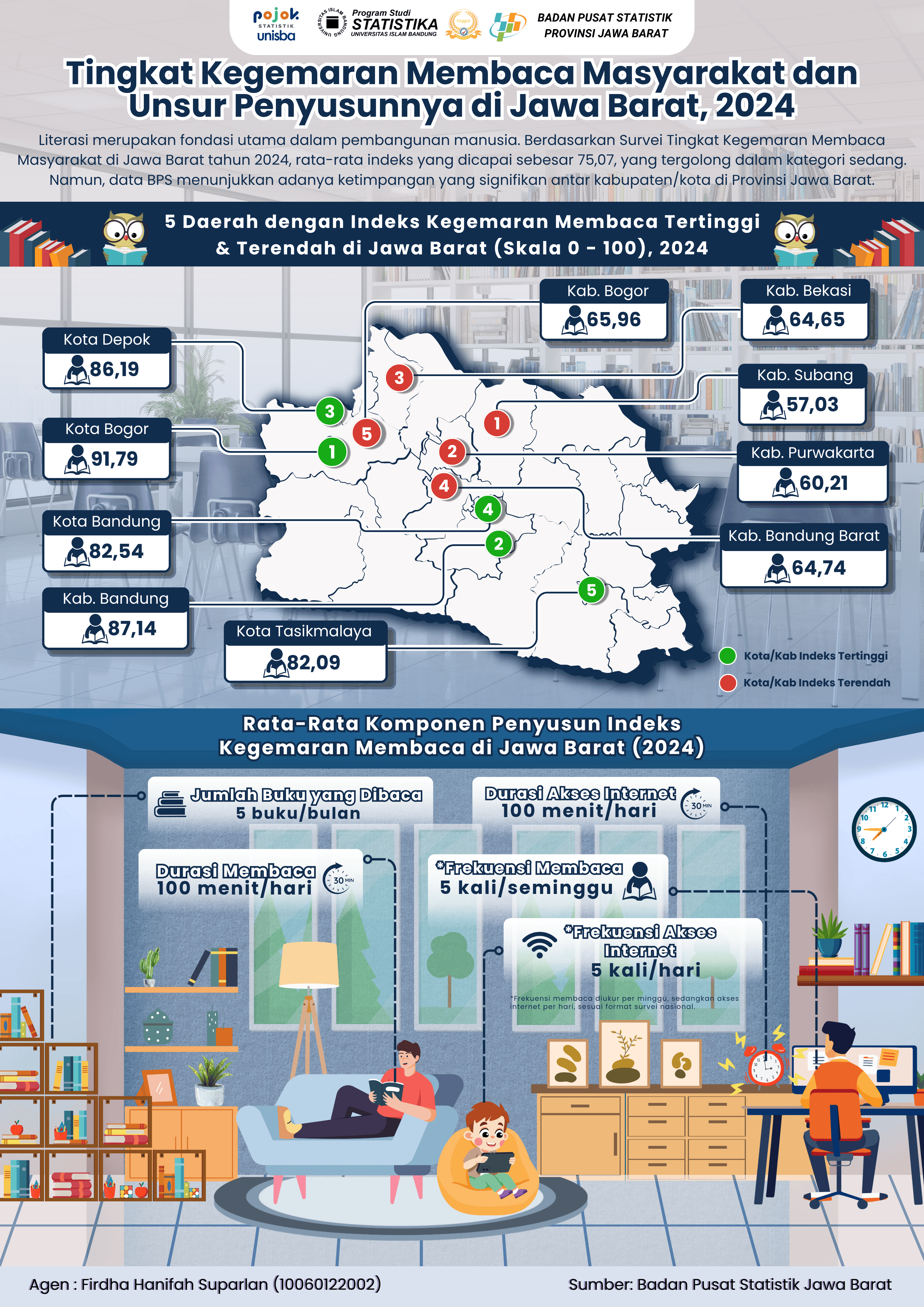 Infografis ini menampilkan data hasil Survei Kegemaran Membaca Masyarakat di Jawa Barat tahun 2024, termasuk indeks tertinggi dan terendah di tiap kabupaten/kota serta indikator penyusunnya.