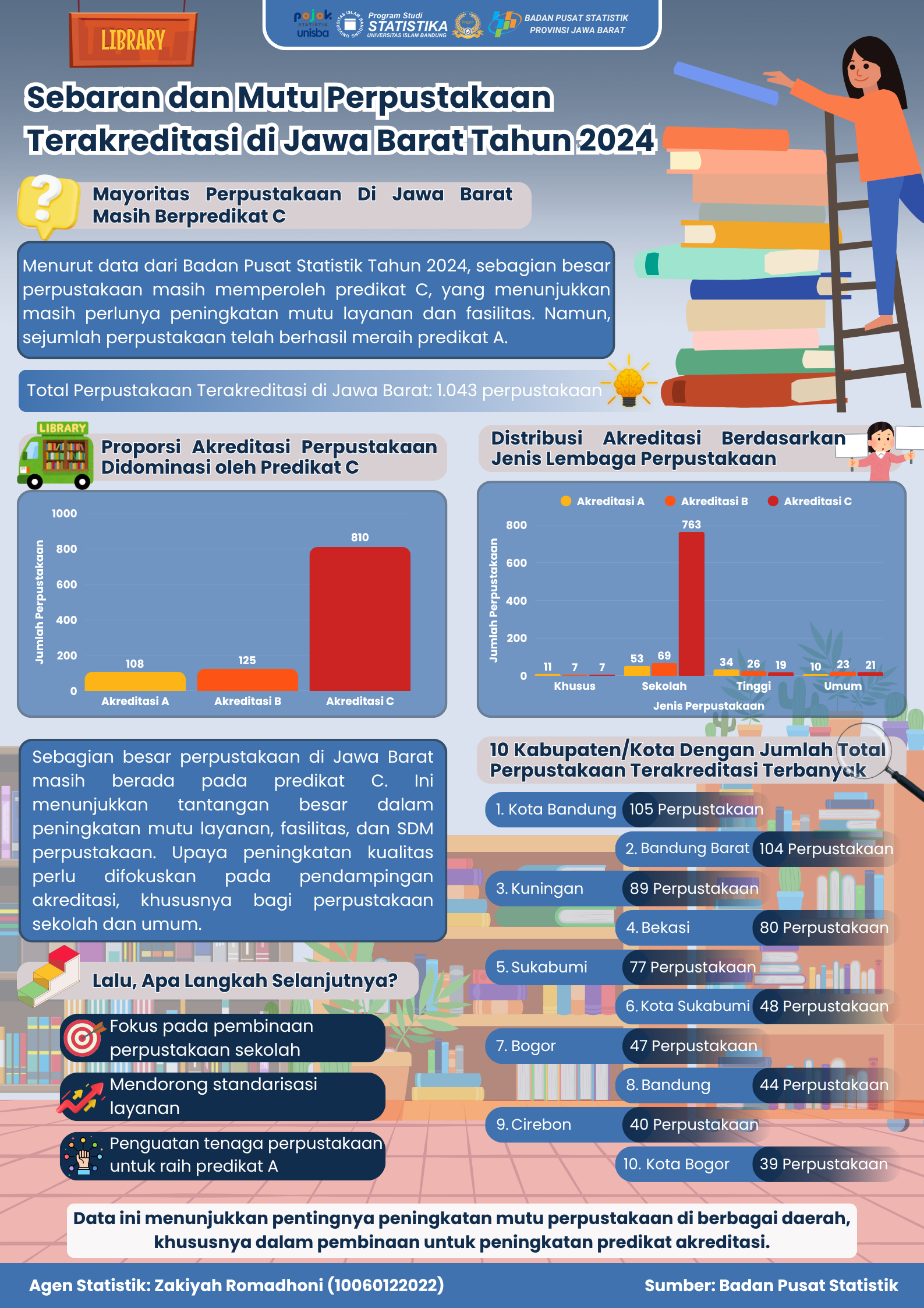 Infografis ini menyajikan data mengenai jumlah dan mutu perpustakaan yang telah terakreditasi di Provinsi Jawa Barat tahun 2024. Berdasarkan data dari Badan Pusat Statistik, terdapat...
