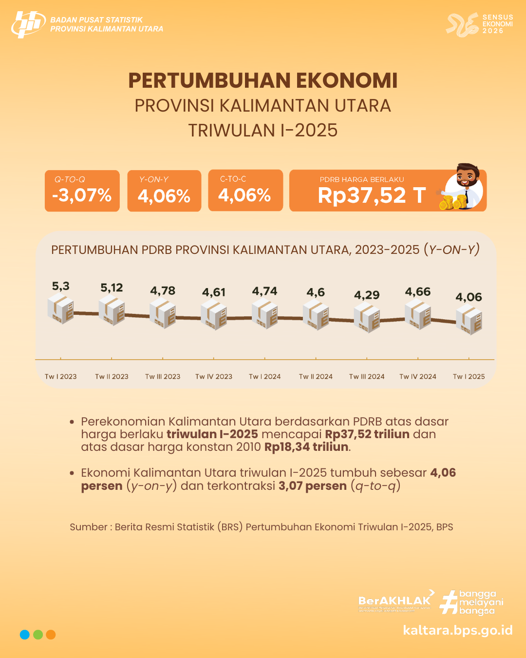 EKONOMI KALIMANTAN UTARA TRIWULAN I - 2025 Ekonomi Provinsi Kalimantan Utara Triwulan I Tahun 025 tumbuh 4,06% (y-on y). Ingin tahu lebih banyak tentang ekonomi...