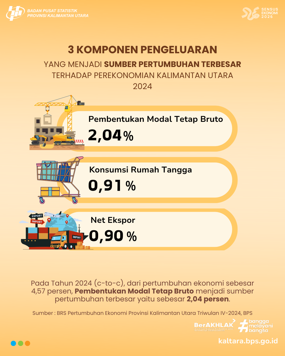 SUMBER PERTUMBUHAN EKONOMI MENURUT PENGELUARAN 2024 Ekonomi Provinsi Kalimantan Utara tahun 2024 tumbuh 4,57%. Berikut 3 Komponen Pengeluaran yang menjadi sumber pertumbuhan terbesar terhadap perekonomian...