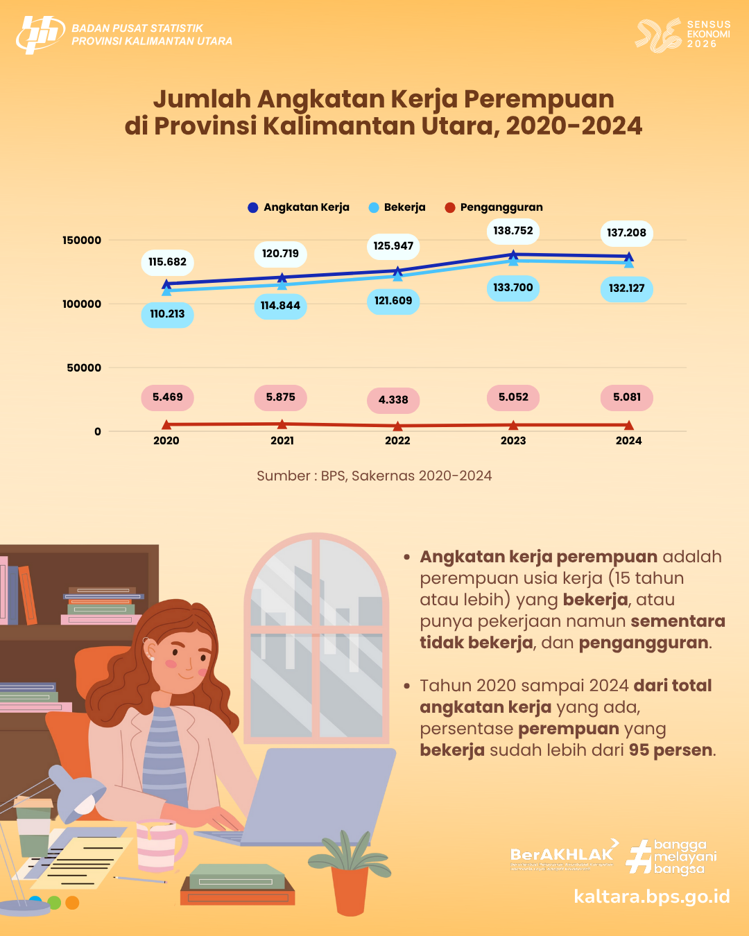 ANGKATAN KERJA PEREMPUAN PROVINSI KALIMANTAN UTARA Halo #sahabatdata Tahukah kamu? Jumlah angkatan kerja perempuan di Provinsi Kalimantan Utara terus menunjukkan tren positif dari tahun 2020...