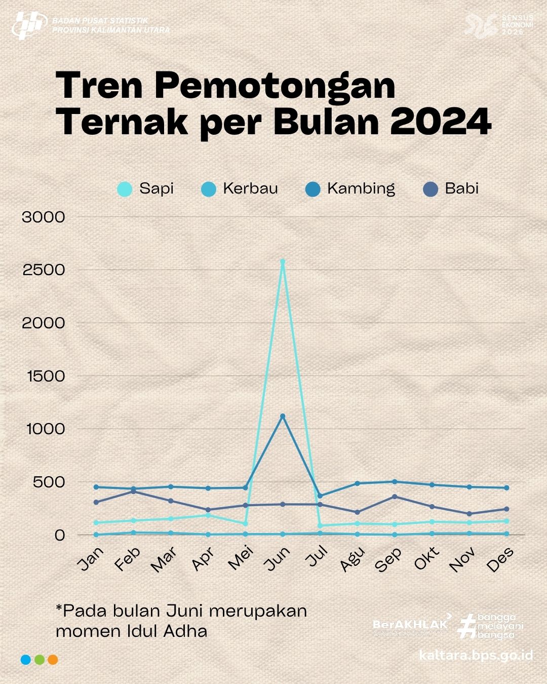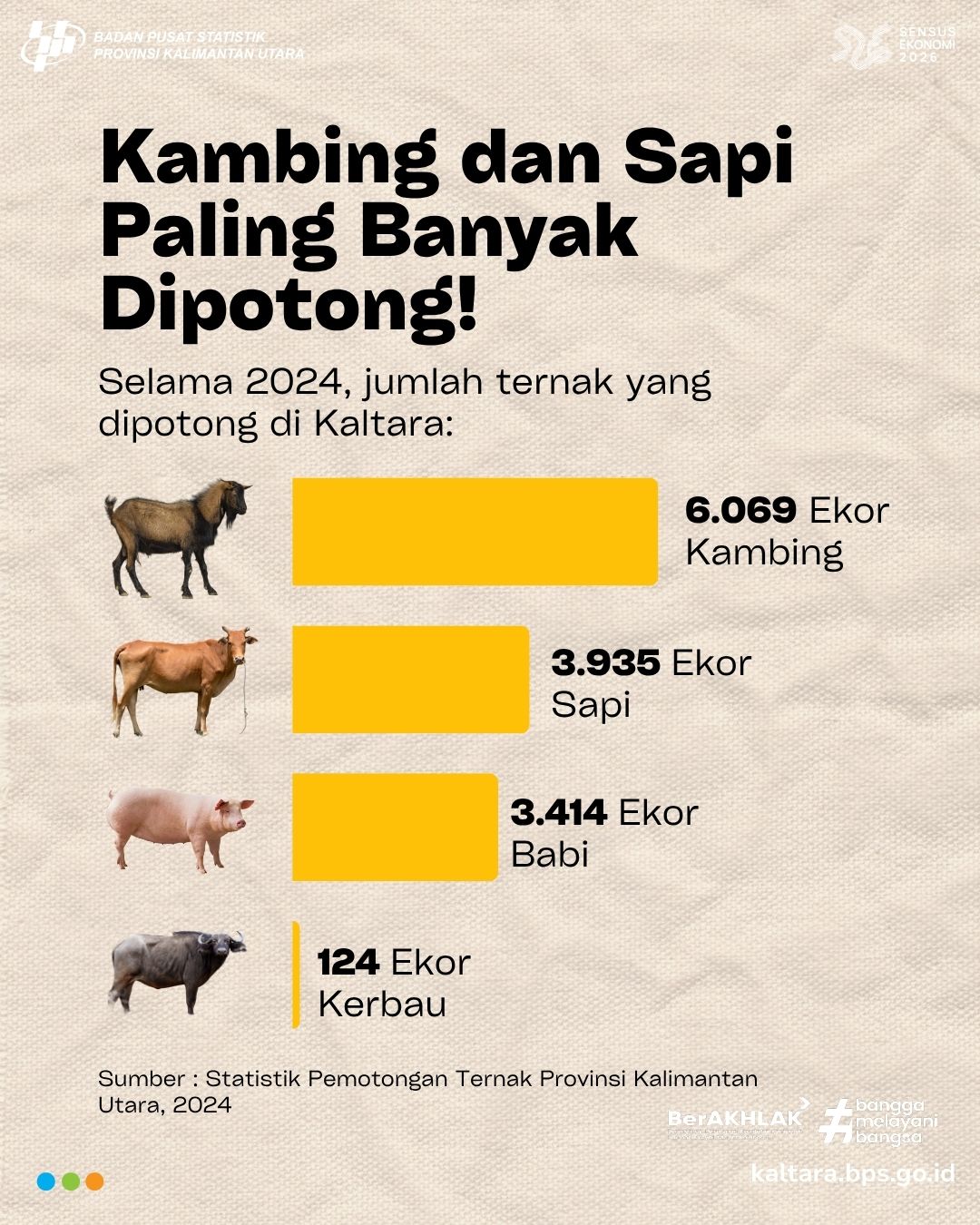 INTIP PEMOTONGAN TERNAK KALTARA 2024! Halo #sahabatdata Tahukah kamu? Selama 2024, kambing jadi hewan paling banyak dipotong di Kaltara! Produksi daging dari pemotongan ternak jadi...