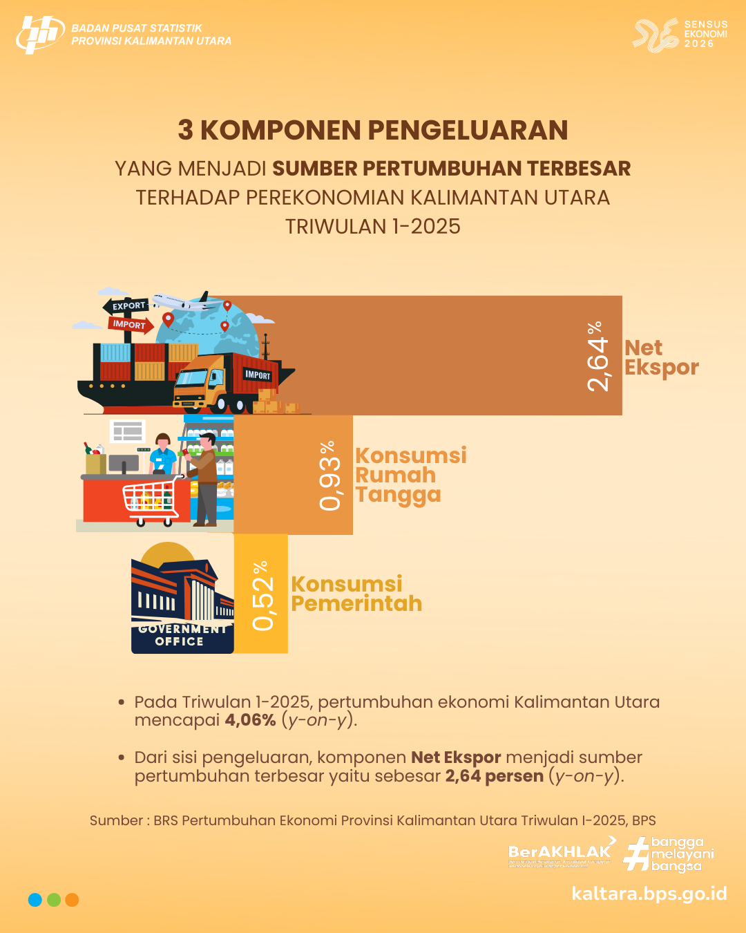 SUMBER PERTUMBUHAN EKONOMI MENURUT PENGELUARAN TRIWULAN 1-2025 Ekonomi Provinsi Kalimantan Utara Triwulan I-2025 tumbuh 4,06%. Ingin tahu apa saja 3 komponen pengeluaran yang menjadi sumber...