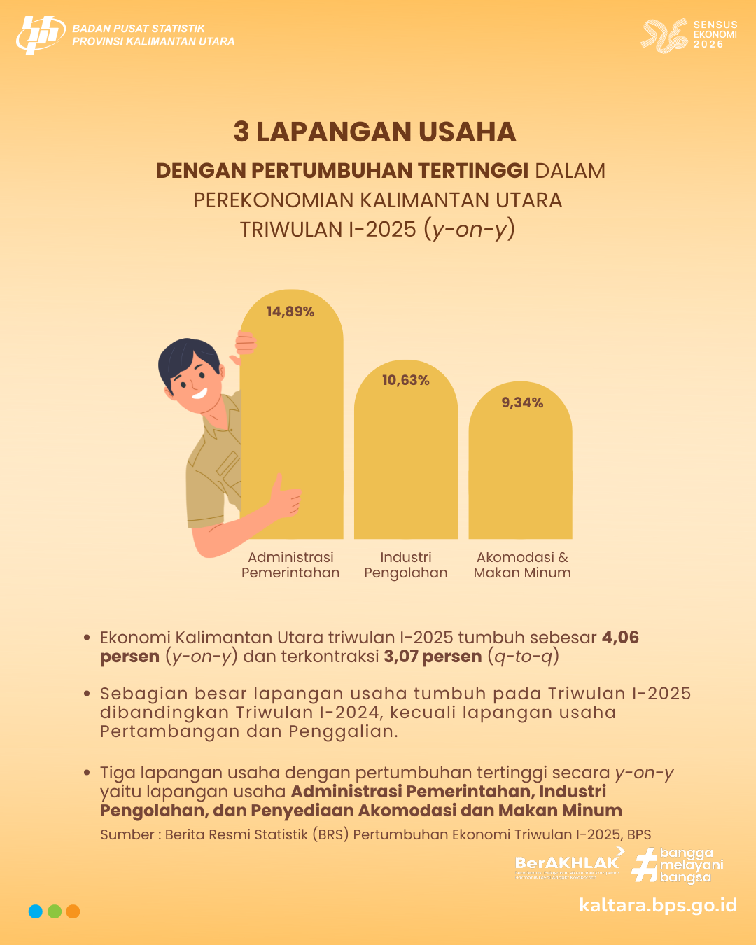 3 LAPANGAN USAHA DENGAN PERTUMBUHAN TERTINGGI TRIWULAN I-2025 Ekonomi Provinsi Kalimantan Utara Triwulan I Tahun 2025 tumbuh 4,06% (y-ony). Ingin tahu lebih banyak apa saja...