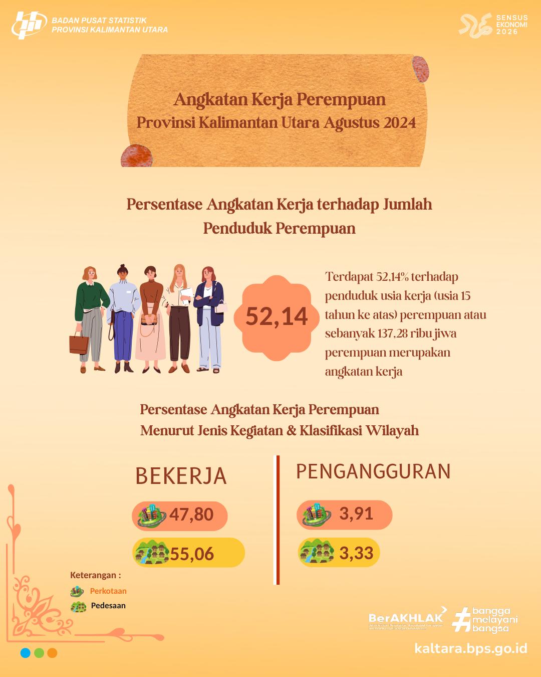 ANGKATAN KERJA PEREMPUAN Pada Agustus 2024 total penduduk usia kerja (usia 15 tahun keatas) Provinsi Kalimantan Utara adalah sebanyak 559,62 ribu jiwa. 47,02 persen diantaranya...