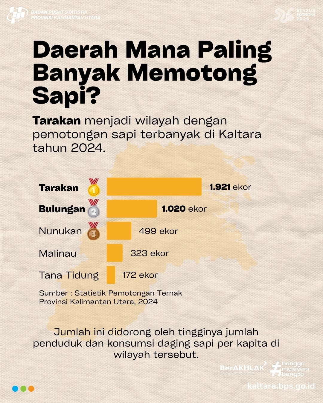 BERAPA SAPI YANG DIPOTONG DI TAHUN 2024? Halo #SahabatData 👋 Tahukah kamu? Sepanjang tahun 2024, ribuan ekor sapi dipotong di Kalimantan Utara, baik di RPH...