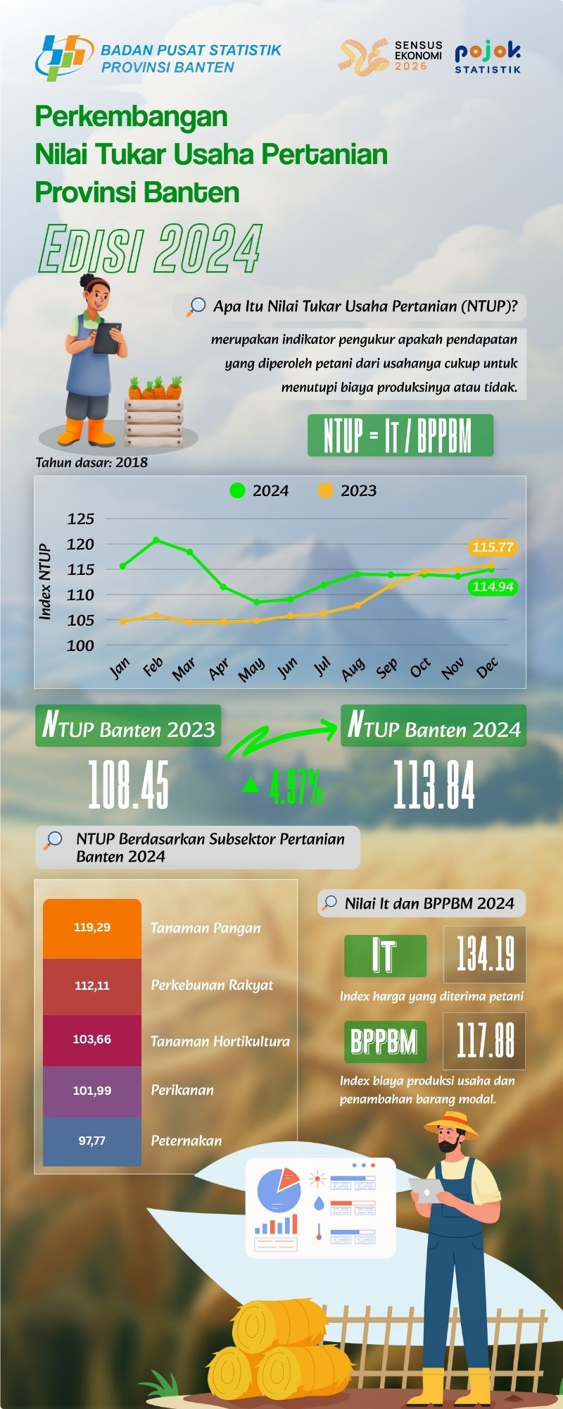 Nilai Tukar Usaha Petani (NTUP) mencerminkan kemampuan produksi petani berdasarkan perbandingan pergerakan harga diterima petani terhadap pergerakan harga biaya produksi dan penambahan barang modal yang...