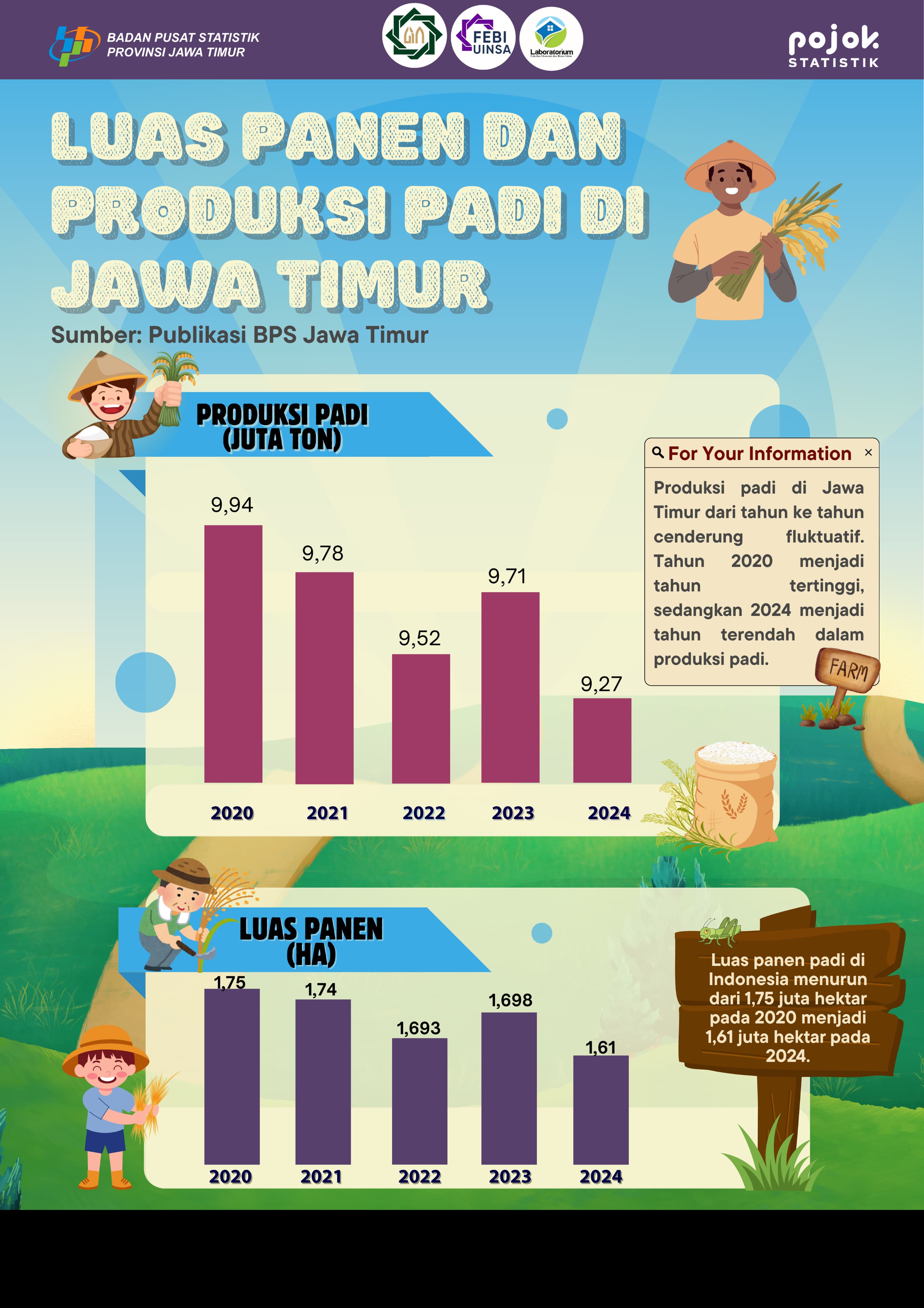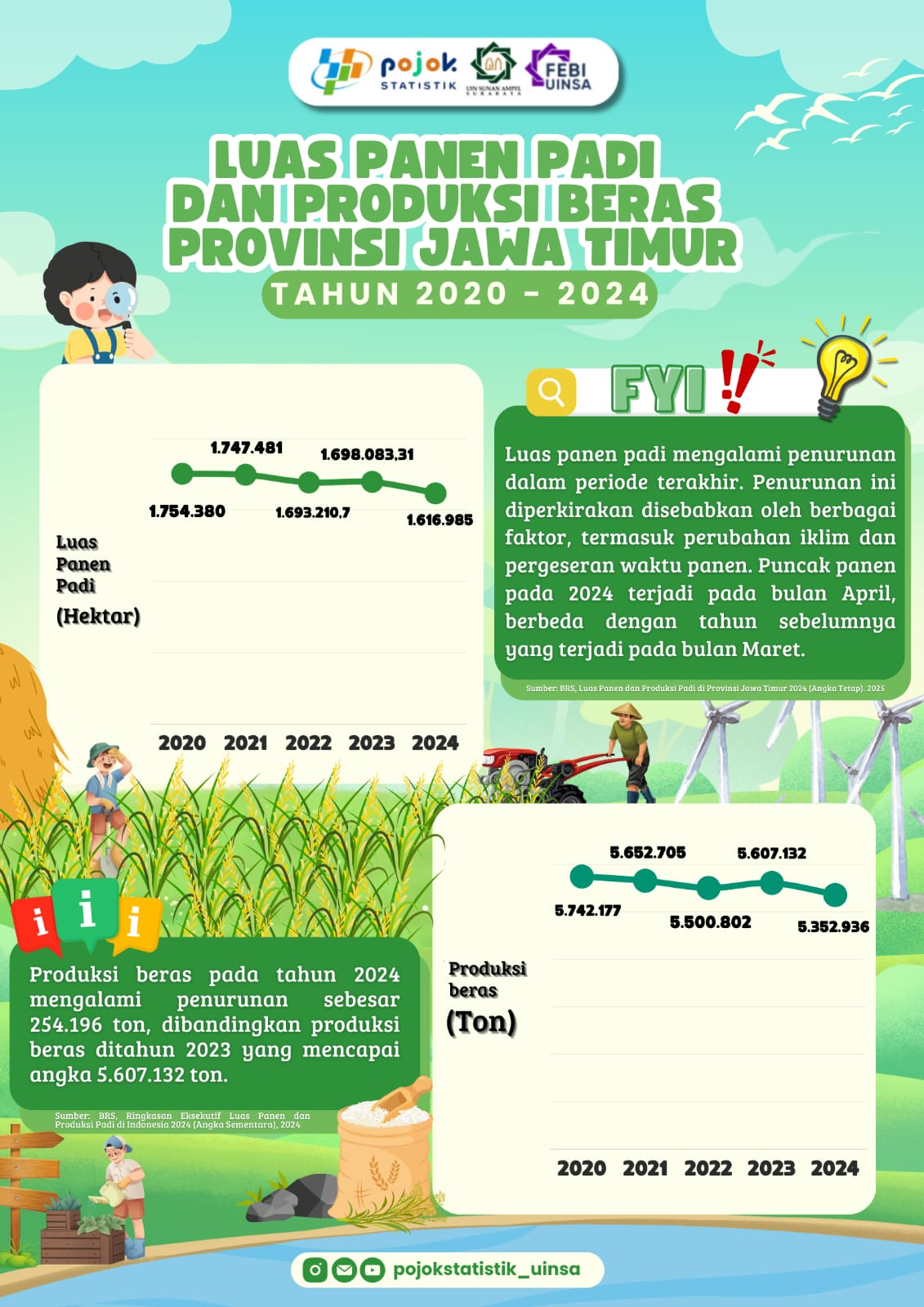 Infografis ini menunjukkan data produksi padi dan luas panen di Jawa Timur dari tahun 2020 hingga 2024 yang cenderung fluktuatif. Produksi padi tertinggi terjadi pada...