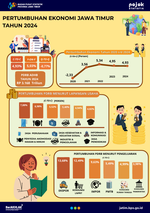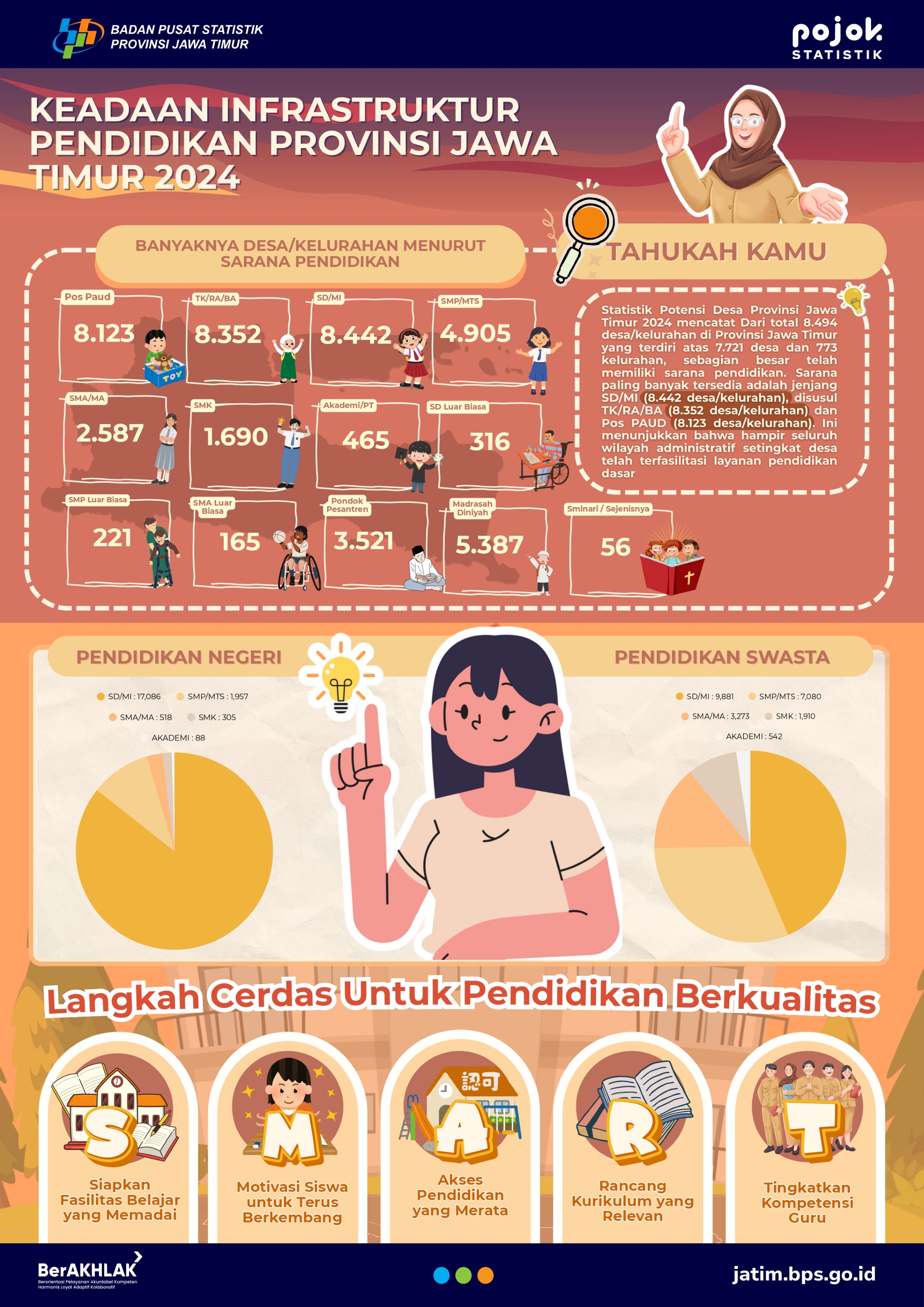 Infografis ini menyajikan gambaran keadaan infrastruktur pendidikan di Provinsi Jawa Timur tahun 2024, mencakup jumlah satuan pendidikan dari tingkat dasar hingga perguruan tinggi, baik negeri...