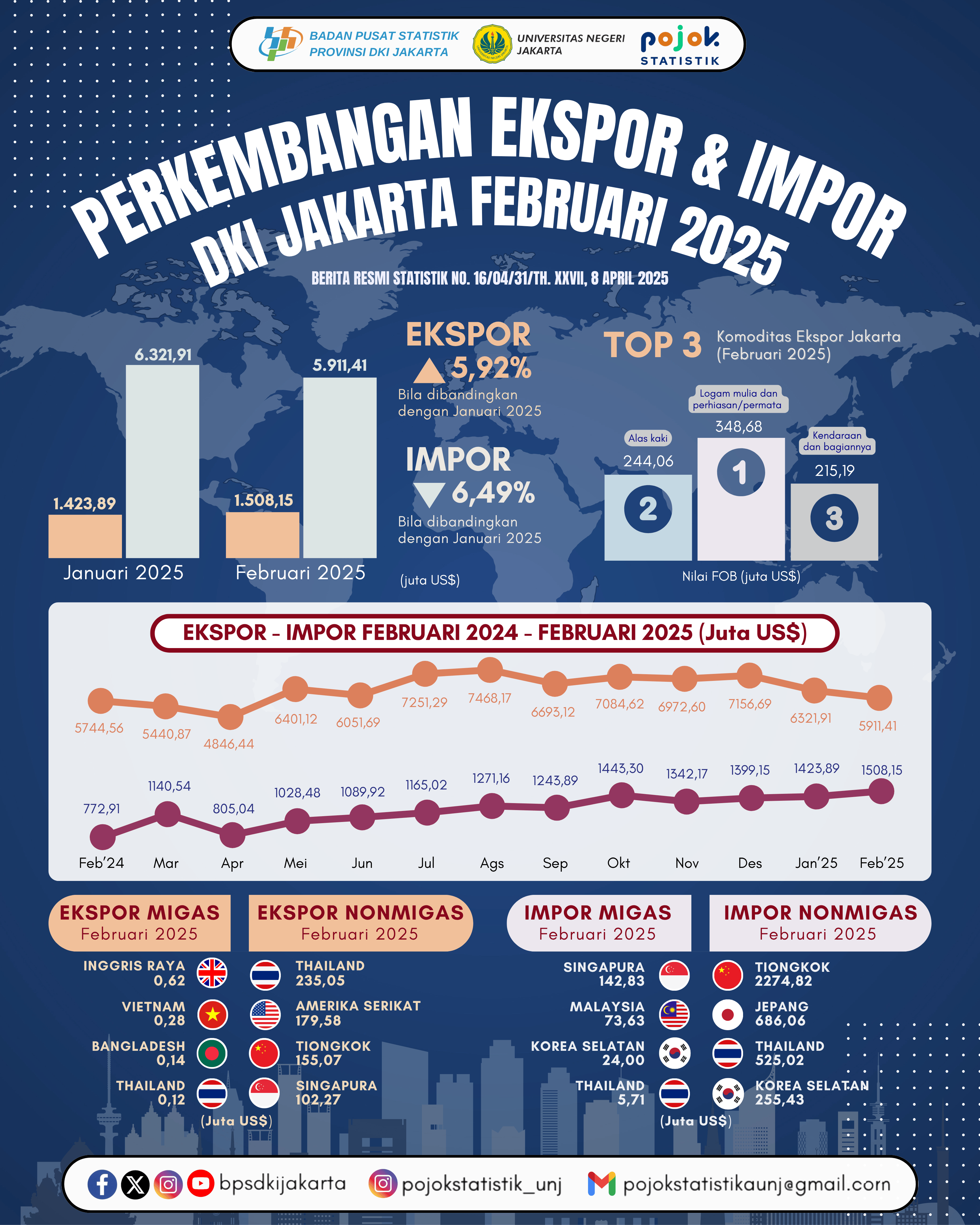 🌍 Ekspor & Impor DKI Jakarta – Februari 2025 | Berdasarkan data BPS Provinsi DKI Jakarta, nilai ekspor mencapai US$1,51 miliar, turun 5,92% dibanding Januari...