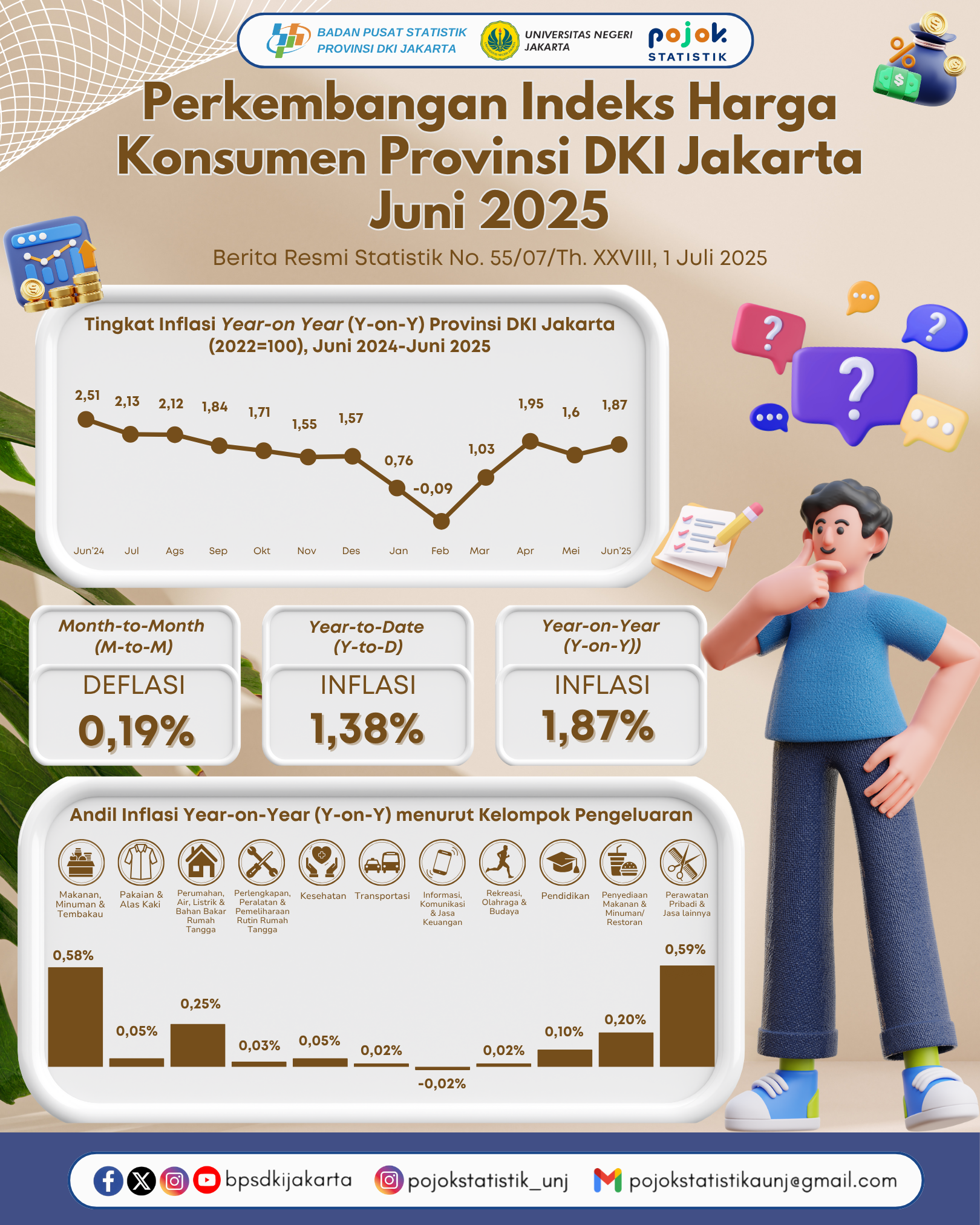 IHK DKI - Juni 2025 | BPS DKI mencatat inflasi 0,19% (m-to-m) sehingga secara year-to-date (y-to-d) terjadi inflasi 1,38%, sedangkan inflasi tahunan (y-on-y) tercatat sebesar...