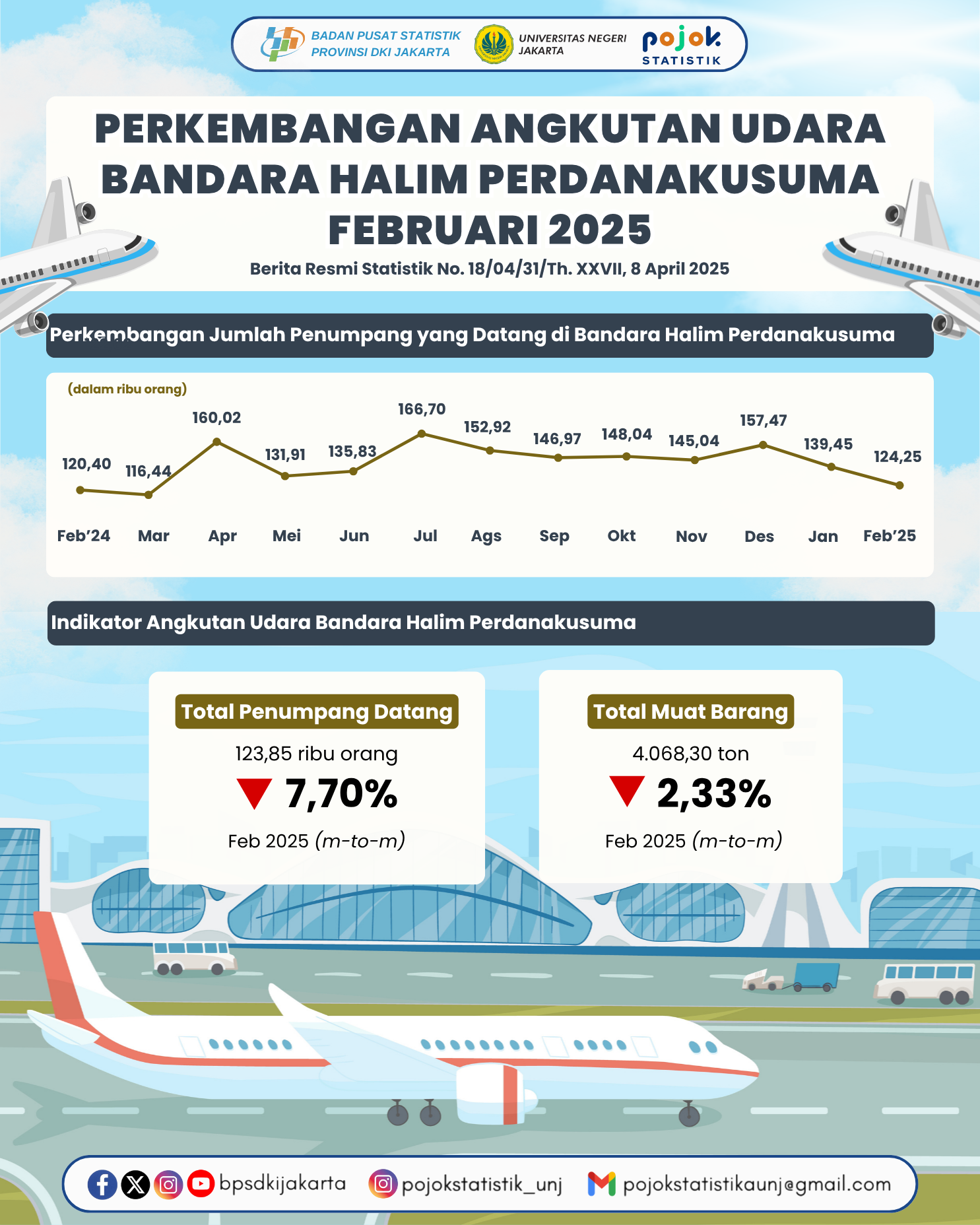 Transportasi DKI - Angkutan Udara Februari 2025 | Aktivitas penerbangan di Bandara Halim Perdanakusuma mengalami penurunan pada Februari 2025. Jumlah penumpang datang tercatat sebanyak 123,85...