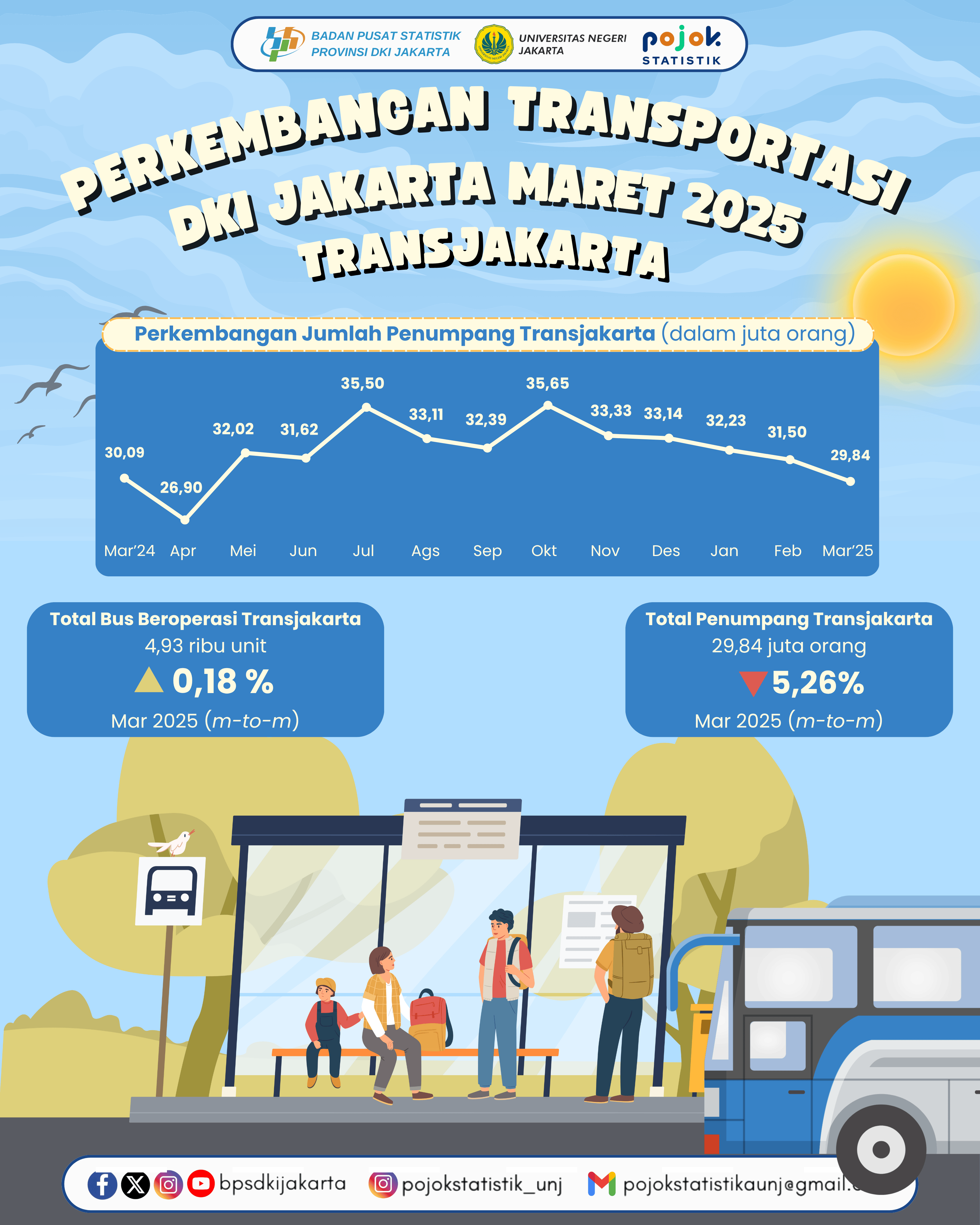 🚌 Transportasi DKI – Transjakarta Maret 2025 | Berdasarkan data BPS Provinsi DKI Jakarta, jumlah penumpang Transjakarta pada Maret 2025 tercatat 29,84 juta orang, turun...