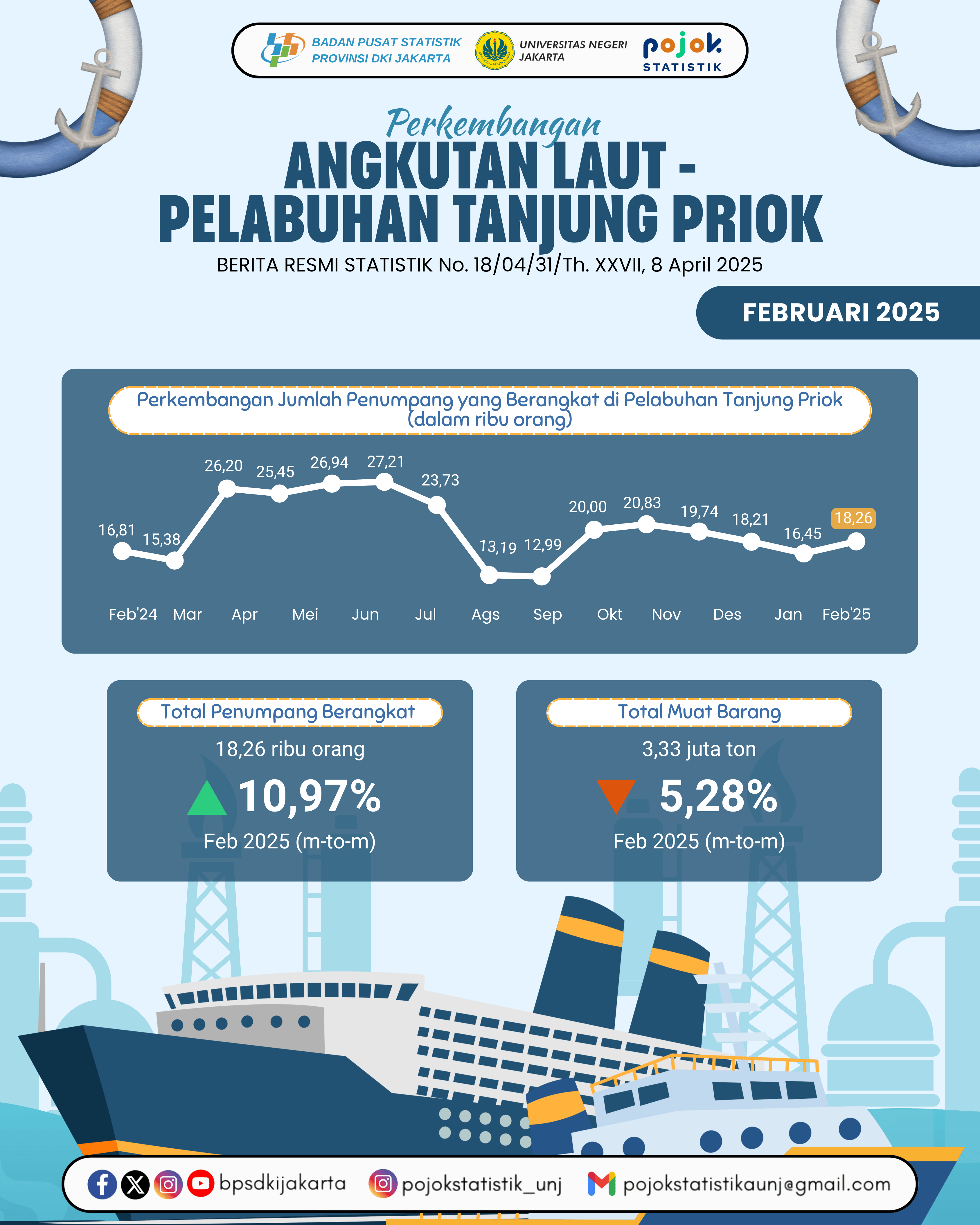 🚢 Transportasi DKI – Angkutan Laut Februari 2025 | Berdasarkan data BPS Provinsi DKI Jakarta, jumlah penumpang yang berangkat melalui Pelabuhan Tanjung Priok tercatat 18,26...