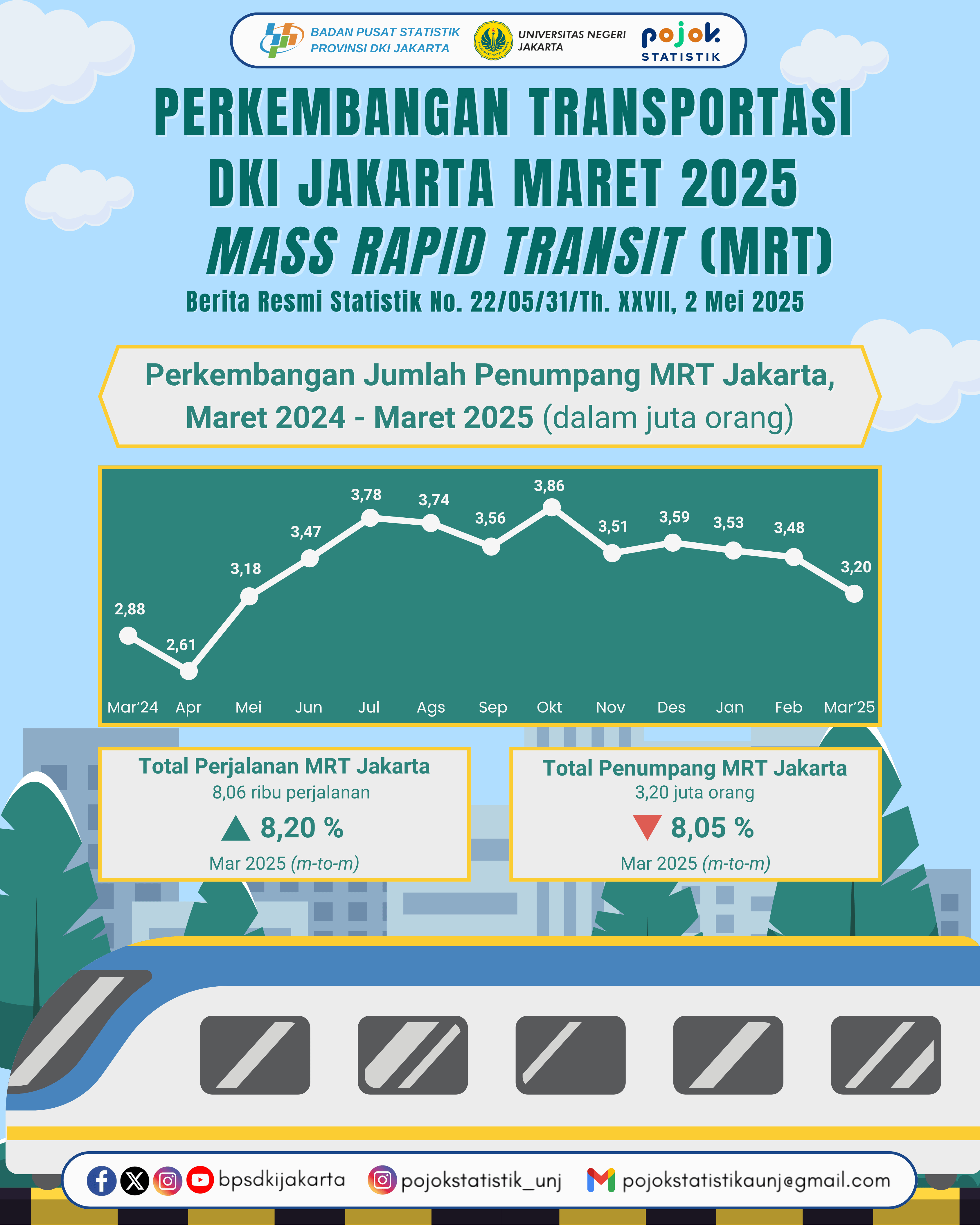 🚇 Transportasi DKI – MRT Jakarta Maret 2025 | Berdasarkan data BPS Provinsi DKI Jakarta, total perjalanan MRT tercatat 8,06 ribu perjalanan, naik 8,20% dibanding...
