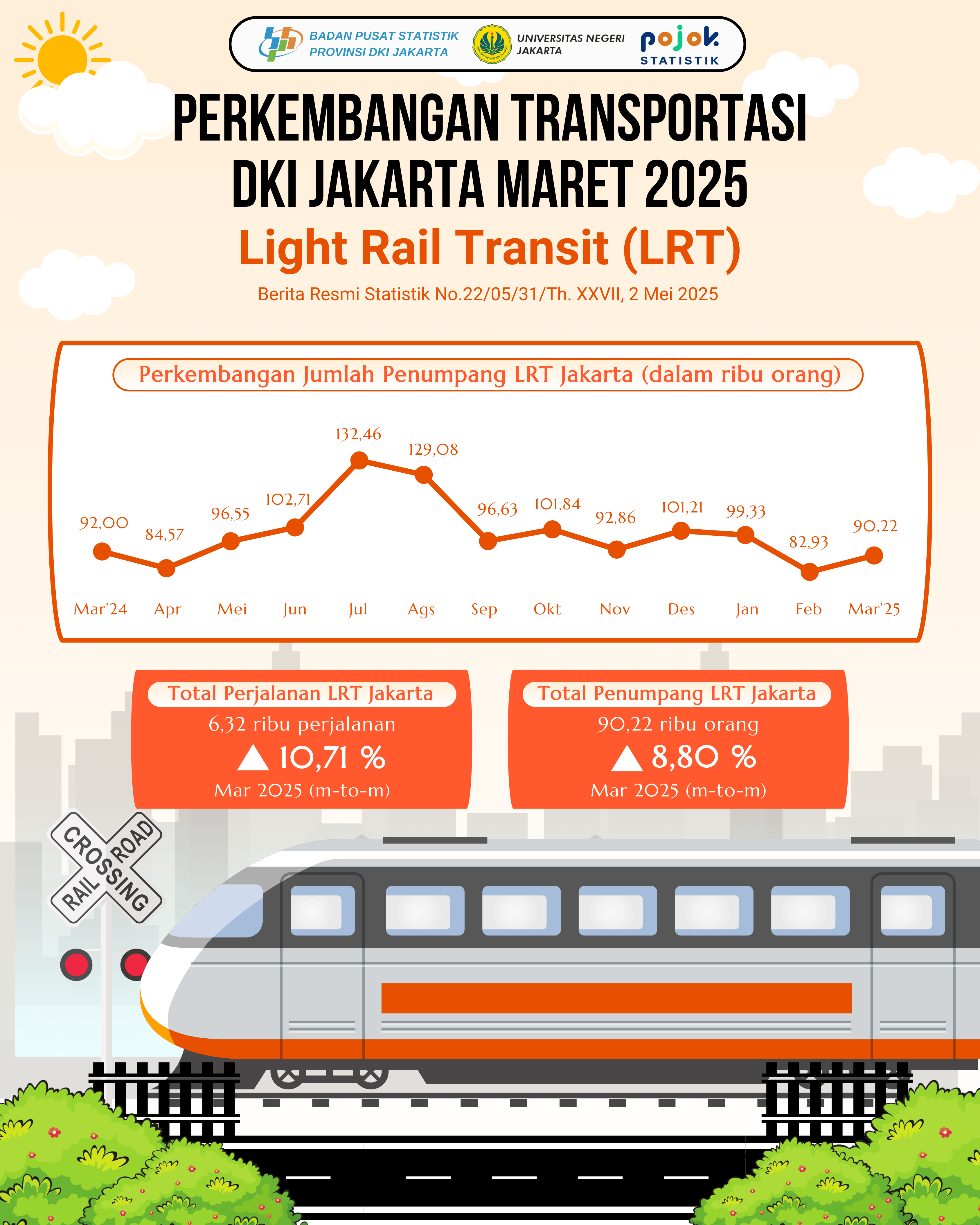 🚈 Transportasi DKI – LRT Jakarta Maret 2025 | Berdasarkan data BPS Provinsi DKI Jakarta, total perjalanan LRT pada Maret 2025 tercatat 6,32 ribu perjalanan,...