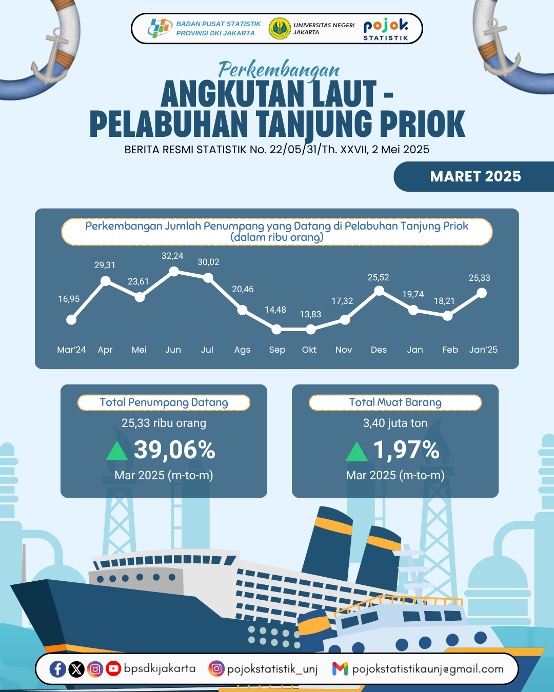 🚢 Transportasi DKI – Angkutan Laut Maret 2025 | Berdasarkan data BPS Provinsi DKI Jakarta, jumlah penumpang datang di Pelabuhan Tanjung Priok tercatat sebanyak 25,33...