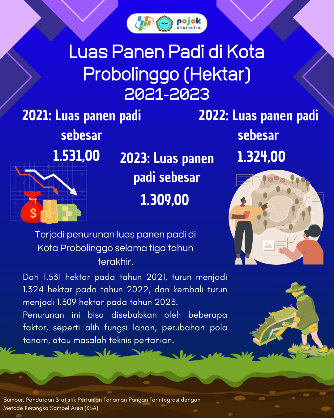 Teriadi penurunan luas panen padi di Kota Probolinggo selama tiga tahun terakhir. Dari 1.531 hektar pada tahun 2021, turun menjadi 1.324 hektar pada tahun 2022,...