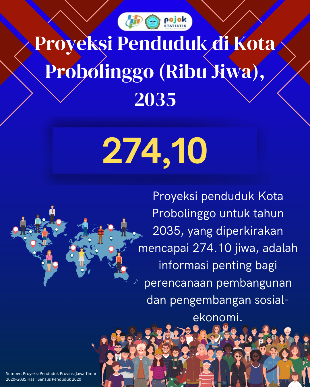 Proyeksi penduduk Kota Probolinggo untuk tahun 2035, yang diperkirakan mencapai 274.10 jiwa, adalah informasi penting bagi perencanaan pembangunan dan pengembangan sosial-ekonomi.