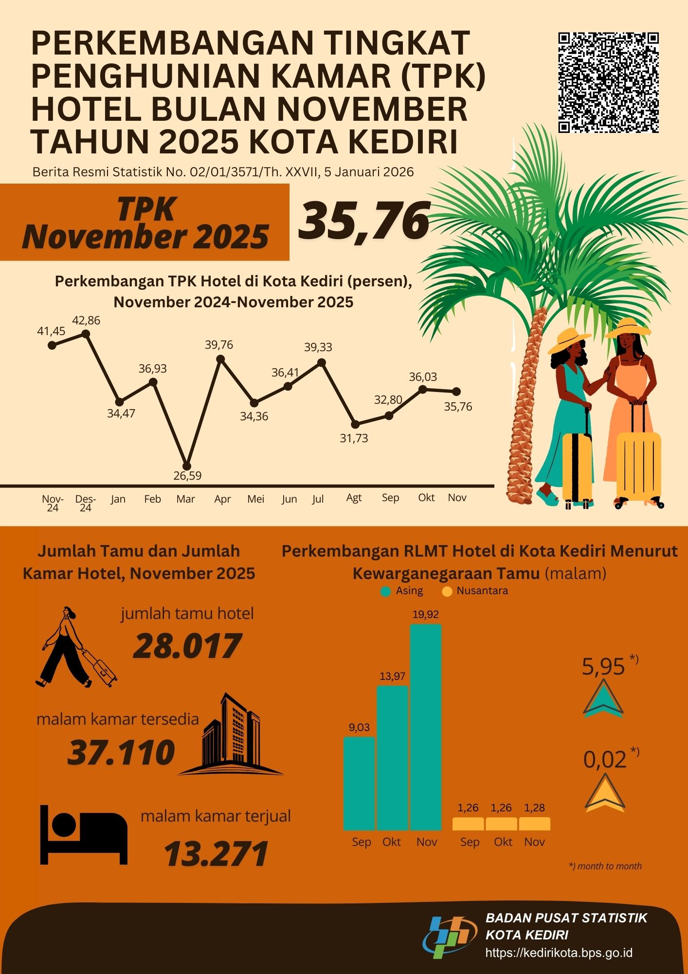 Tingkat penghunian kamar (TPK) hotel pada bulan November tahun 2025 di Kota Kediri sebesar 35,76 persen